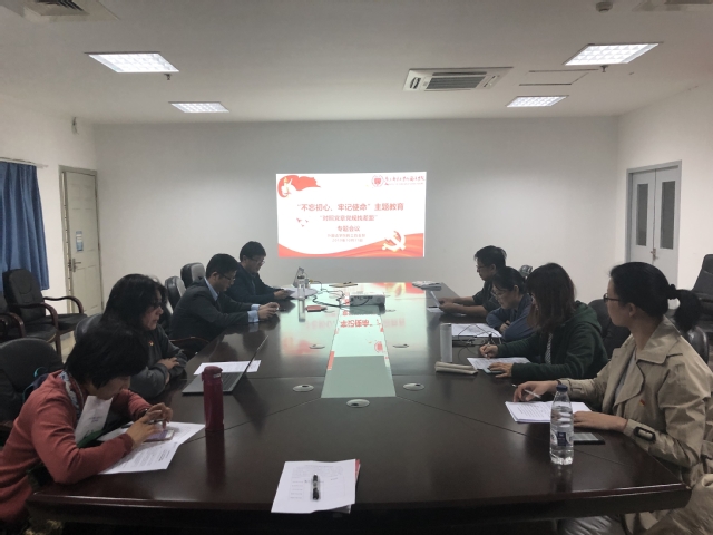 会议传达了中共南京邮电大学委员会《关于在“不忘初心、牢记使命”主题教育中对照党章党规找差距的工作方案》精神,重点学习了党章、《中国共产党廉洁自律准则》、《关于新形势下党内政治生活的若干准则》、《中国共产党纪律处分条例》等党内法规。会上,全体支部党员对照党章党规,结合岗位工作实际,以刀刃向内的自我革命精神着力查摆自己在自己在党的意识、党员意识、工作作风、遵规守纪等方面的差距和不足,列出个人问题清单,明确整改措施。支部书记对每名党员的整改措施进行审核把关,督促整改到位。