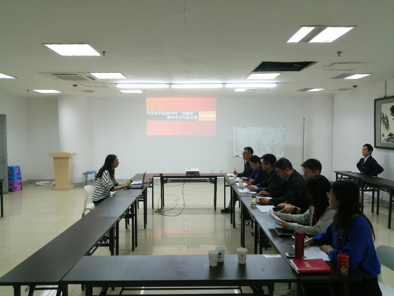 为选拔优秀的作品参加学校第二十一届“创新杯”课外学术科技作品竞赛,10月24日上午,新葡的京集团8814在圆楼521会议室举行2019年“创新杯”课外学术作品竞赛学院选拔赛。新葡的京集团8814党委书记陈晓波、副院长臧庆、党委副书记徐欣娅、翻译系主任陶李春、分团委书记王新涛、辅导员高艳丽、蒋丽婷、谭鑫8位老师作为本次选拔赛的评委,听取了参赛作品负责人的成果汇报,并与团队成员作了深入指导交流。