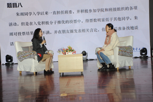 值得一提的是,在理论宣讲环节中,高艳丽老师、蒋丽婷老师结合“不忘初心、牢记使命”主题教育学习内容,分别以“文化自信”、“道路自信”为主题展开宣讲。宣讲中,两位老师结合时政热点和学生工作典型案例,对习近平新时代中国特色社会主义思想、党的十九届四中全会精神进行了精彩阐释,宣讲内容富有哲理,语言精准凝练,形式活泼生动,引起了师生强烈共鸣。