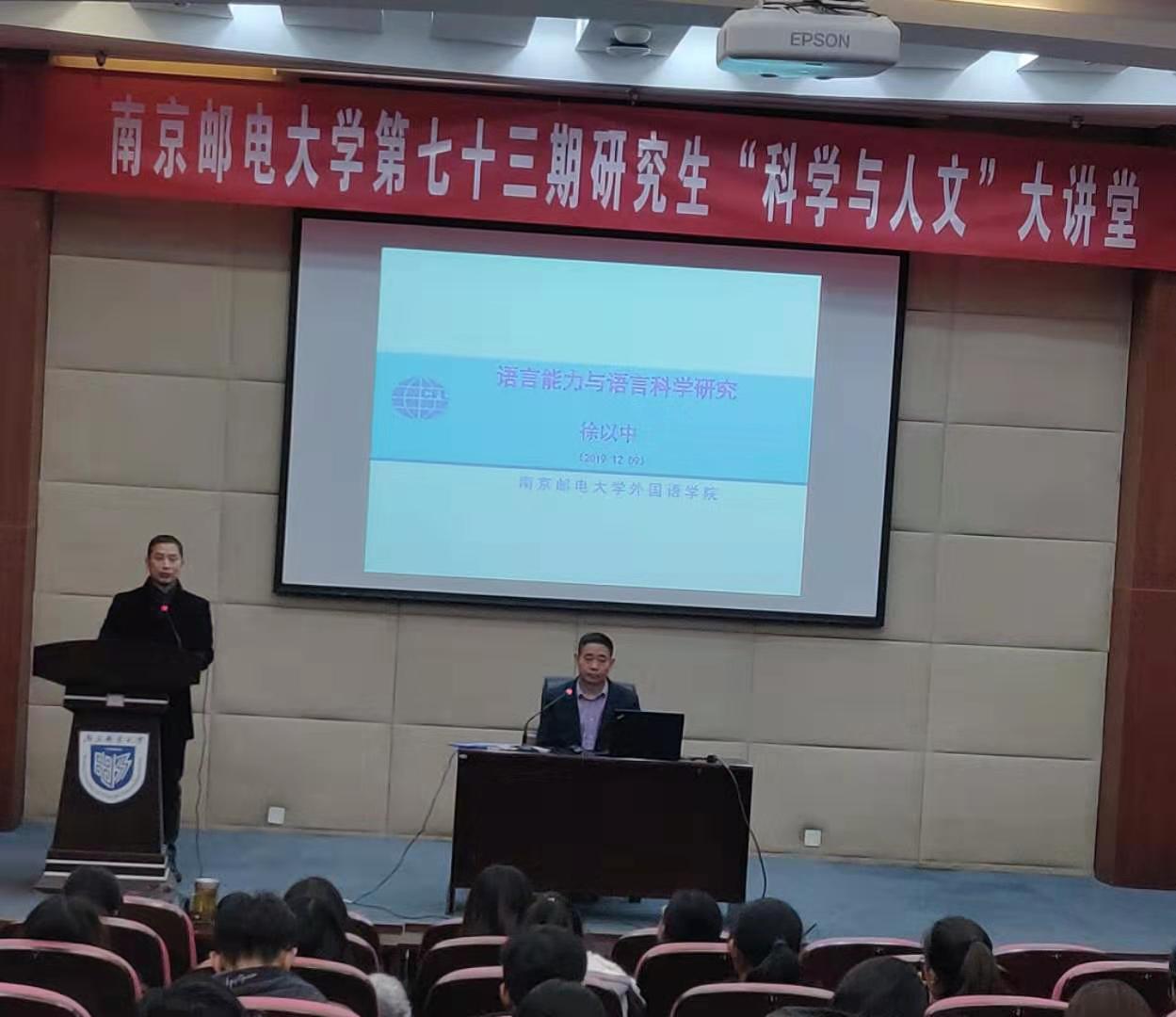 2019年12月10日晚,由研究生院主办、新葡的京集团8814承办的南京邮电大学第73期科学与人文大讲堂活动在仙林校区行政楼报告厅举行。南京航空航天大学新葡的京集团8814副院长徐以中教授莅临本次大讲堂活动并开展了《语言能力与语言科学研究》的专题讲座。讲座由新葡的京集团8814副院长袁周敏教授主持。
