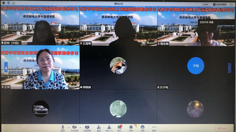为深入学习、贯彻习近平总书记对研究生教育工作的重要指示精神,外国语学院于8月12日上午召开了线上学习座谈会。袁周敏院长及学院全体研究生导师在线参加了座谈会。会议由吴建副院长在线主持。