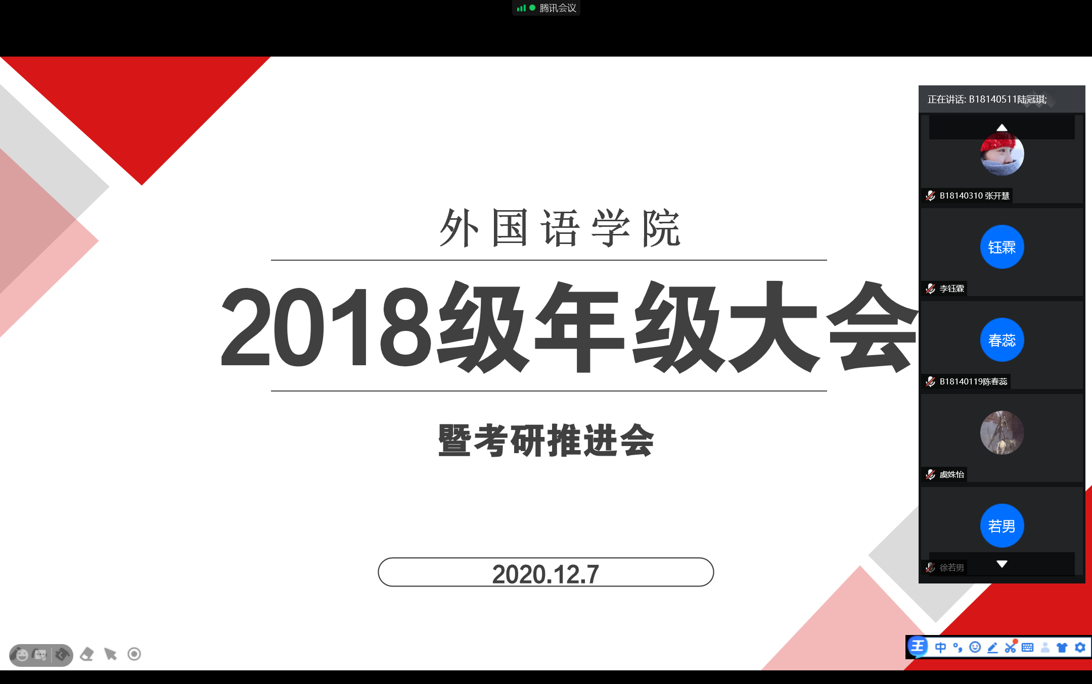 12月7日晚19:00,新葡的京集团88142018级学生于腾讯会议线上召开本学期第二次年级大会。会议由辅导员蒋丽婷主持,2018级全体学生参加。