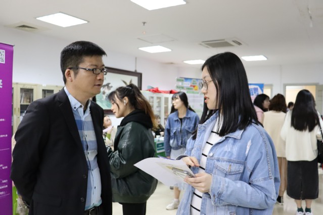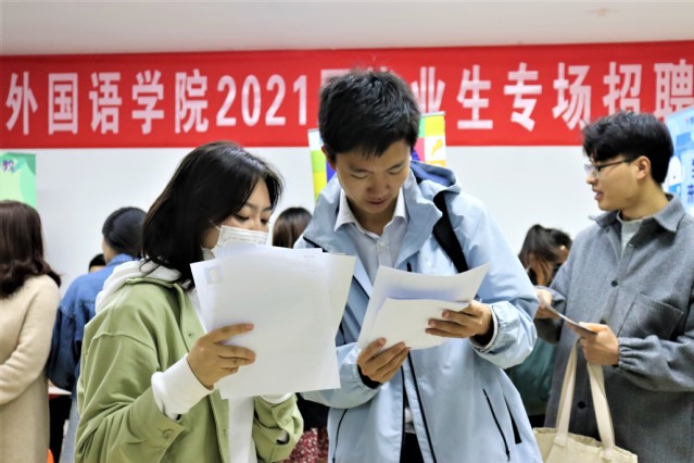 本次招聘会涉及外贸、英语培训讲师、运营、课程顾问、英文编辑等多个岗位,内容涵盖英语、日语、法语等各类语种,各招聘单位摆出了企业优势、岗位前景、员工福利等各类利好政策吸引学生,到场同学根据学院提前发布的具体岗位信息,有针对性地与用人单位进一步沟通、投递简历。学院党委书记陈晓波老师、党委副书记徐欣娅老师、2017级辅导员高艳丽老师现场指导,与毕业生和用人单位交流,了解企业用人需求、毕业生求职意向。希望同学们抓住机会,积极应聘,尽快找到理想的工作。