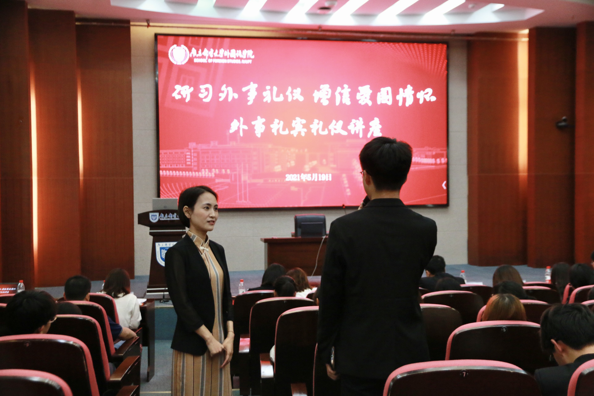 外事礼仪是对外交流交往、大国形象树立的重要手段。省外事翻译中心党支部书记孙健在致辞中指出,礼仪有唤起集体记忆、增进集体情感、整合社会秩序、加强社会团结的作用,希望外院的同学能在讲座中有所收获,培养高尚纯正品格,提升综合素质能力,树立责任担当意识;黄子涵老师在讲座中解释了外事礼仪的概念和特征,向新葡的京集团师生介绍了外事着装、人际交往和各国的风俗习惯,用诙谐有趣的语言加深了学生对外事礼宾礼仪全面生动的了解;高欢老师重点介绍了西餐礼仪,由小及大,以丰富的实际案例引导学生用礼仪涵养爱国主义情怀,从自身出发强化国家形象;在实操环节,同学们现场模拟了外事接待和签约仪式,沉浸式感受一名真正外交官的工作内容。两个多小时的讲座“不催眠、不枯燥”,学生们受益匪浅。新葡的京集团副院长陈琳作总结发言,充分肯定了外交礼宾礼仪对学生成长成才的正向激励作用,希望同学们能内外兼修,努力学习,掌握专业技能,在实现中华民族伟大复兴的中国梦的征程中贡献自己的力量。