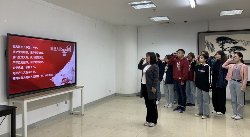 徐欣娅书记领誓,全体师生面对党徽、举起右拳,在庄严的宣誓中强化了理想信念,坚定了党员责任和担当意识;辅导员蒋丽婷给全体研究生党员上思政微党课,以“做新时期‘有理想、有力量、有信仰’的学生干部”为主题,围绕百年党史中的先进典型和英雄事迹,鼓励学生党员从红色育人资源中汲取力量,永葆入党初心,掌握好专业技能,将个人发展与国家命运紧密结合,争做有理想、有本领、有担当的新时代青年。