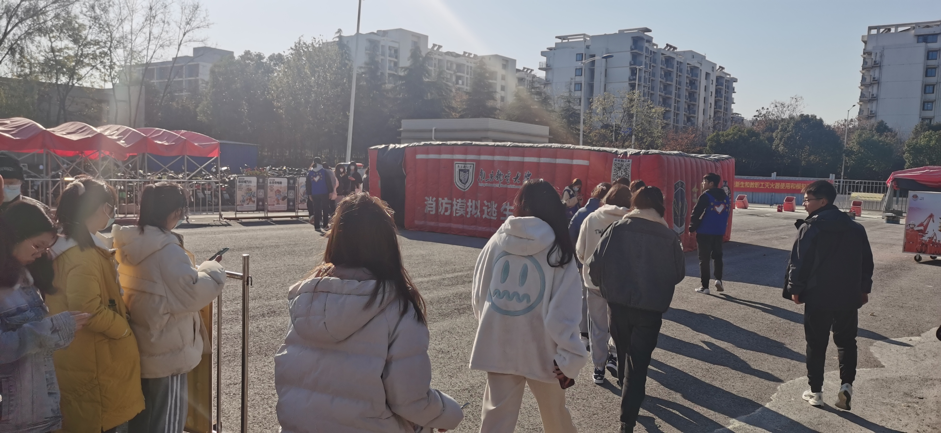 演练由安全员引导同学们进入消防模拟逃生体验屋进行逃生演练开场。随后,张凯老师深入浅出地向大家讲解了火灾后如何逃生自救、如何扑救初级火灾等相关知识。张老师还现场演示正确使用灭火器的步骤和灭火姿势以及逃生的方法,并指导在场师生实操灭火器。