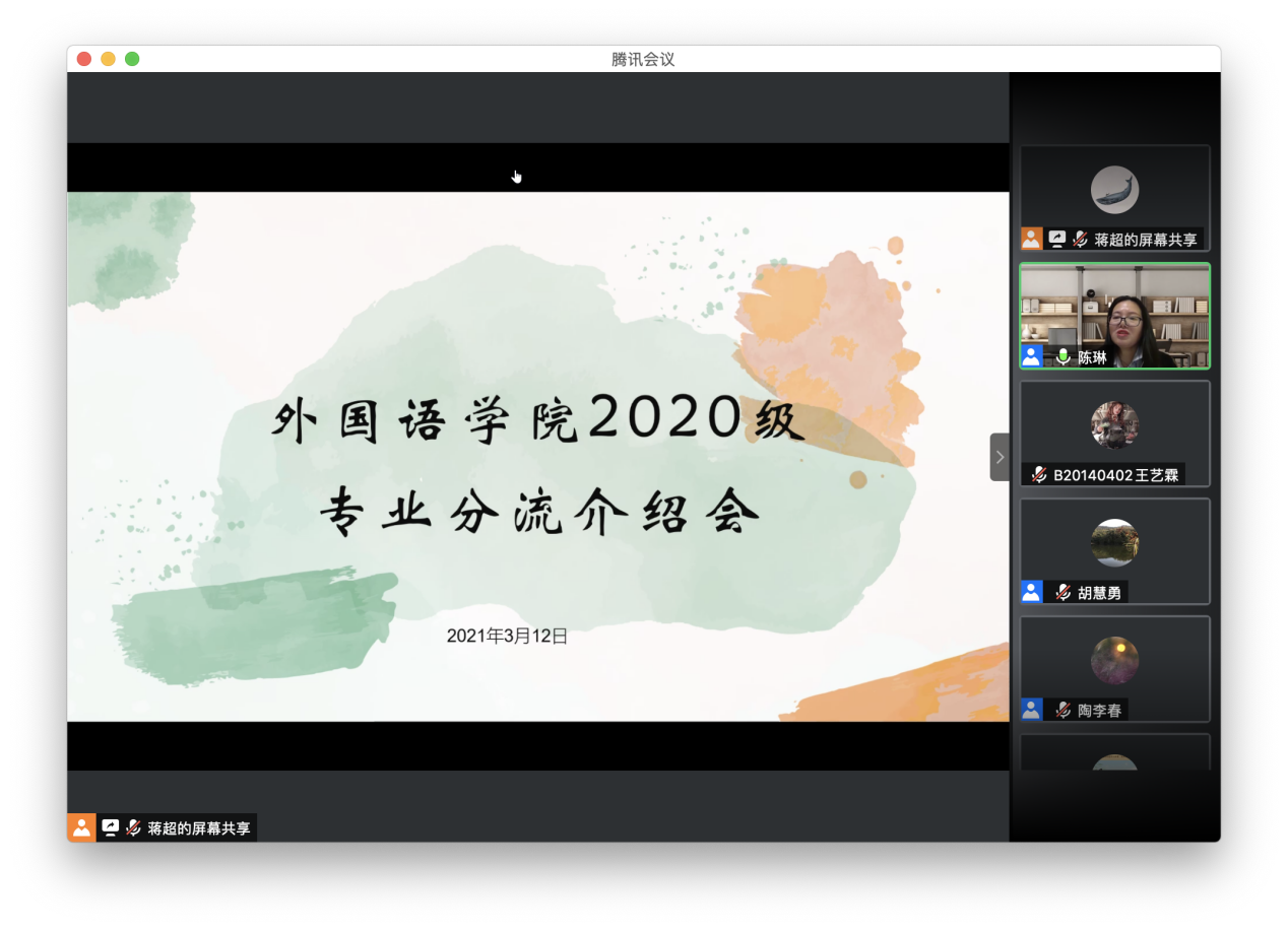 为推动专业分流工作顺利开展,帮助同学们增强专业认识,明确职业生涯规划,2021年3月12日19点,新葡的京集团8814依托腾讯会议召开2020级专业分流介绍会。外国语学院陈琳副院长、英语系胡慧勇主任、翻译系陶李春主任出席本次介绍会,就专业分流概况、专业培养方案、升学就业前景等方面与同学们作了分享与解答。会议由2020级辅导员蒋超老师主持。