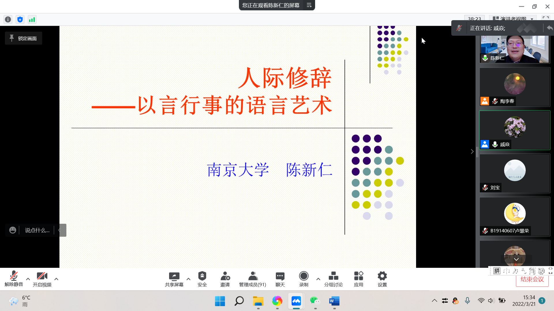 3月21日下午三点半,中国逻辑学会语用学专业委员会会长、南京大学博士生导师陈新仁教授应邀为新葡的京集团8814师生在云端举行了一场题为《人际修辞—以言行事的语言艺术》的讲座。新葡的京集团戚焱教授主持讲座,各系部教师、部分研究生及本科生积极参与聆听学习。