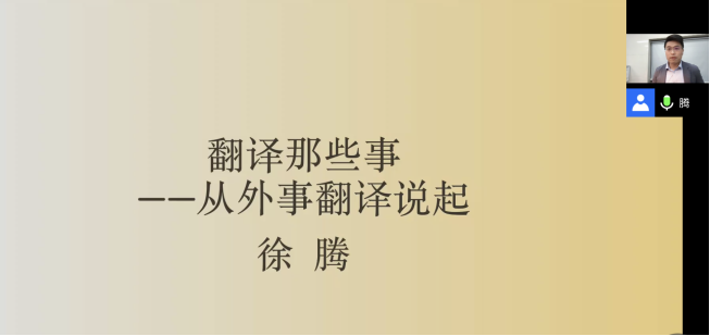 2022年4月27日晚,南京邮电大学第112期菁英人才学校第二次课程在线上举行。为提升学员们的专业能力素养,帮助拓宽国际视野,本次课程邀请到江苏省外事办翻译中心资深译员徐腾老师,就《翻译那些事--从外事翻译说起》这一主题开展授课。