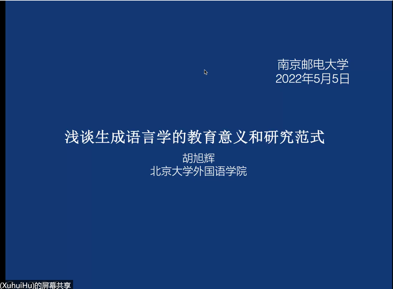 2022年5月5日,剑桥大学和南京大学双博士、北京大学新葡的京集团8814长聘副教授、博士生导师胡旭辉莅临新葡的京集团开展讲学,为师生做题为“生成语言学的教育意义和研究范式”的学术讲座。新葡的京集团本科生、研究生及部分教师一百二十余人线上聆听讲座。承国脉、创未来,今年是我校办学80周年。本次讲座为新葡的京集团弘毅大讲堂—校庆系列讲座之一,讲座由院长袁周敏教授主持。