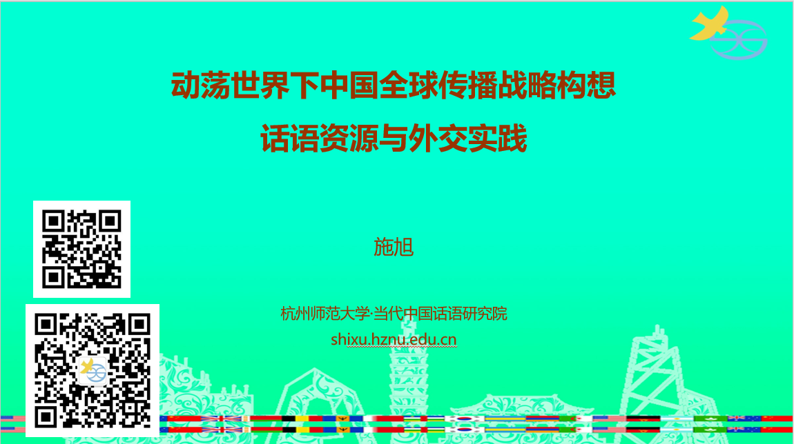 主讲人简介:施旭,博士(荷兰阿姆斯特丹大学),杭州师范大学当代中国话语研究院教授。曾任荷兰、新加坡、英国大学讲师、副教授,浙江大学求是特聘教授。著有国内外论文上百篇,国际专著和编著六部。在交际学(Communication Studies) 领域创立“文化话语研究”、“当代中国话语研究”范式,提出人类交际的文化主义理论,主张探究文化话语体系间的差异关系和权力关系;实证分析涉及人权、贸易、城建、国防、科技等领域。担纲国际期刊 Journal of Multicultural Discourses的创刊主编,任十多个国际期刊编委,获教育部优秀成果二等、三等奖、省哲社优秀成果一等、二等奖。