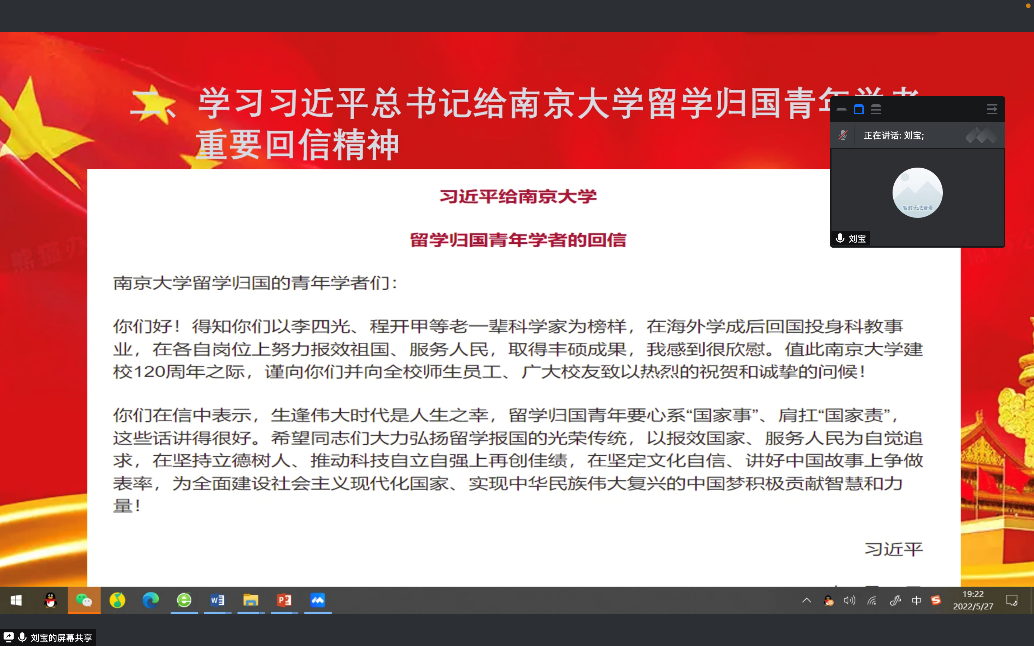 2022年5月25日,新葡的京集团8814教工第三党支部的党员在刘宝副教授的带领下学习了习近平总书记给南京大学留学归国青年学者的重要回信精神。