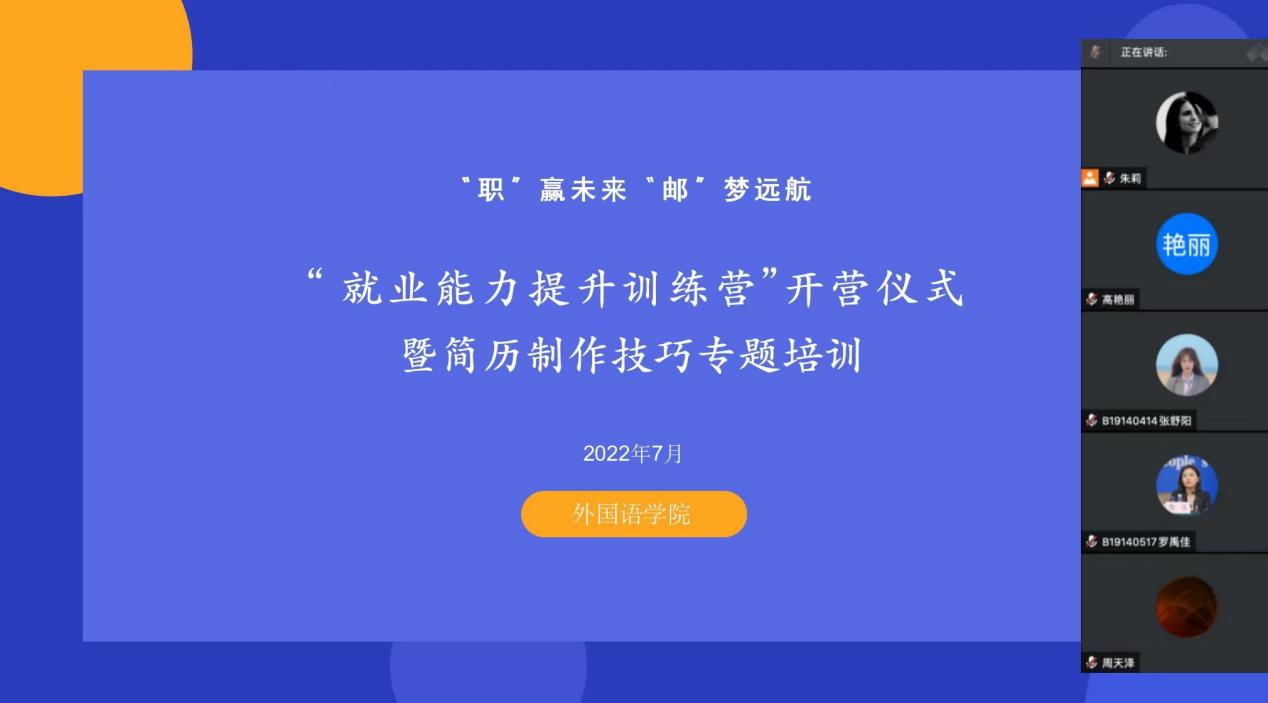 7月18日下午,新葡的京集团8814举行“就业能力提升训练营”开营仪式暨简历制作技巧专题培训会,训练营以“‘职’赢未来,‘邮’梦远航”为主题。学院党委副书记、副院长高艳丽,江苏阿拉丁留学咨询有限公司人事经理朱紫璇和部分2023届应届毕业生参加活动。活动由辅导员朱莉主持。