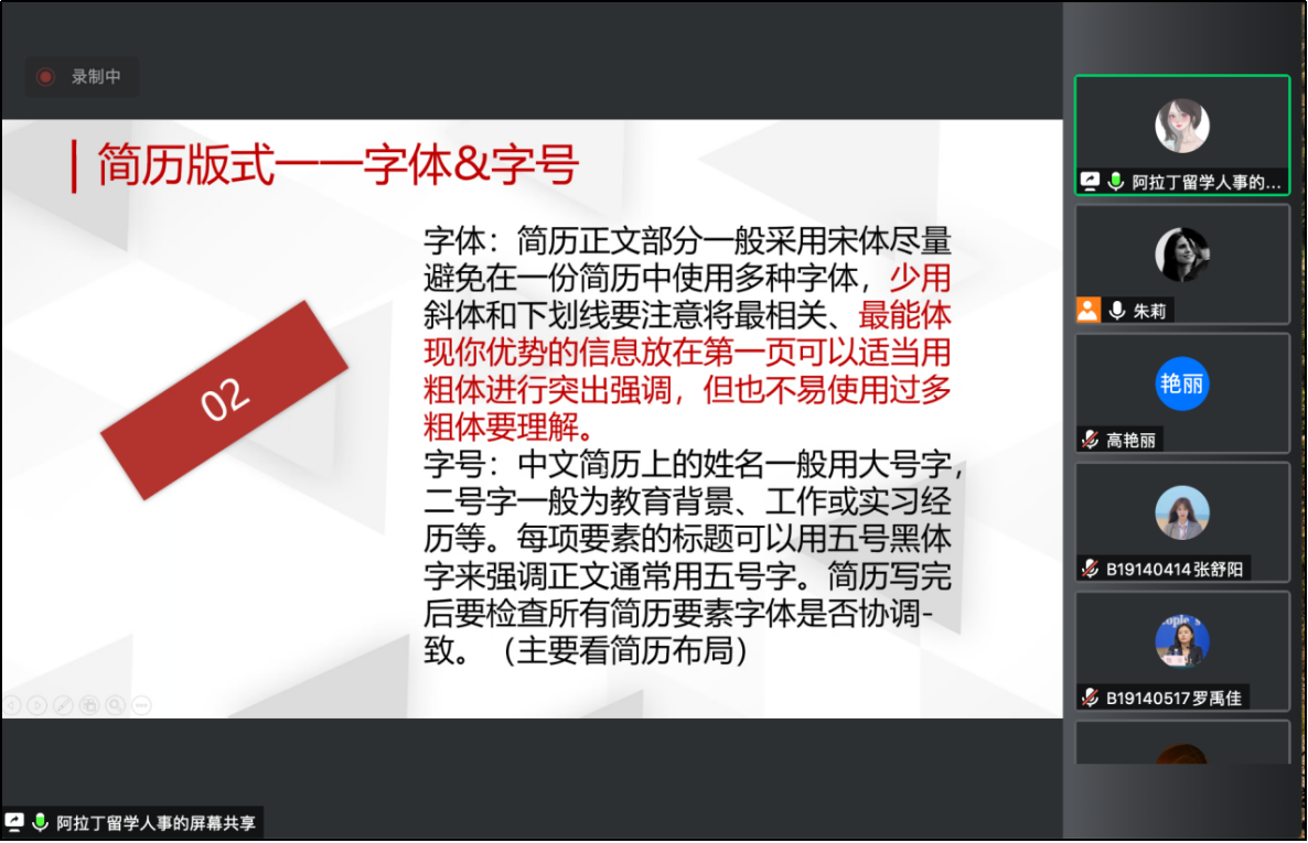 江苏阿拉丁留学咨询有限公司人事经理朱紫璇进行了简历制作技巧培训,从“如何认识简历”“如何制作简历”“简历制作要素解析”等模块进行详细讲授,强调简历制作“三原则”“四要”“五不要”等理论,同时结合实际案例进行分析,帮助学生真正学有所得、学有所用。