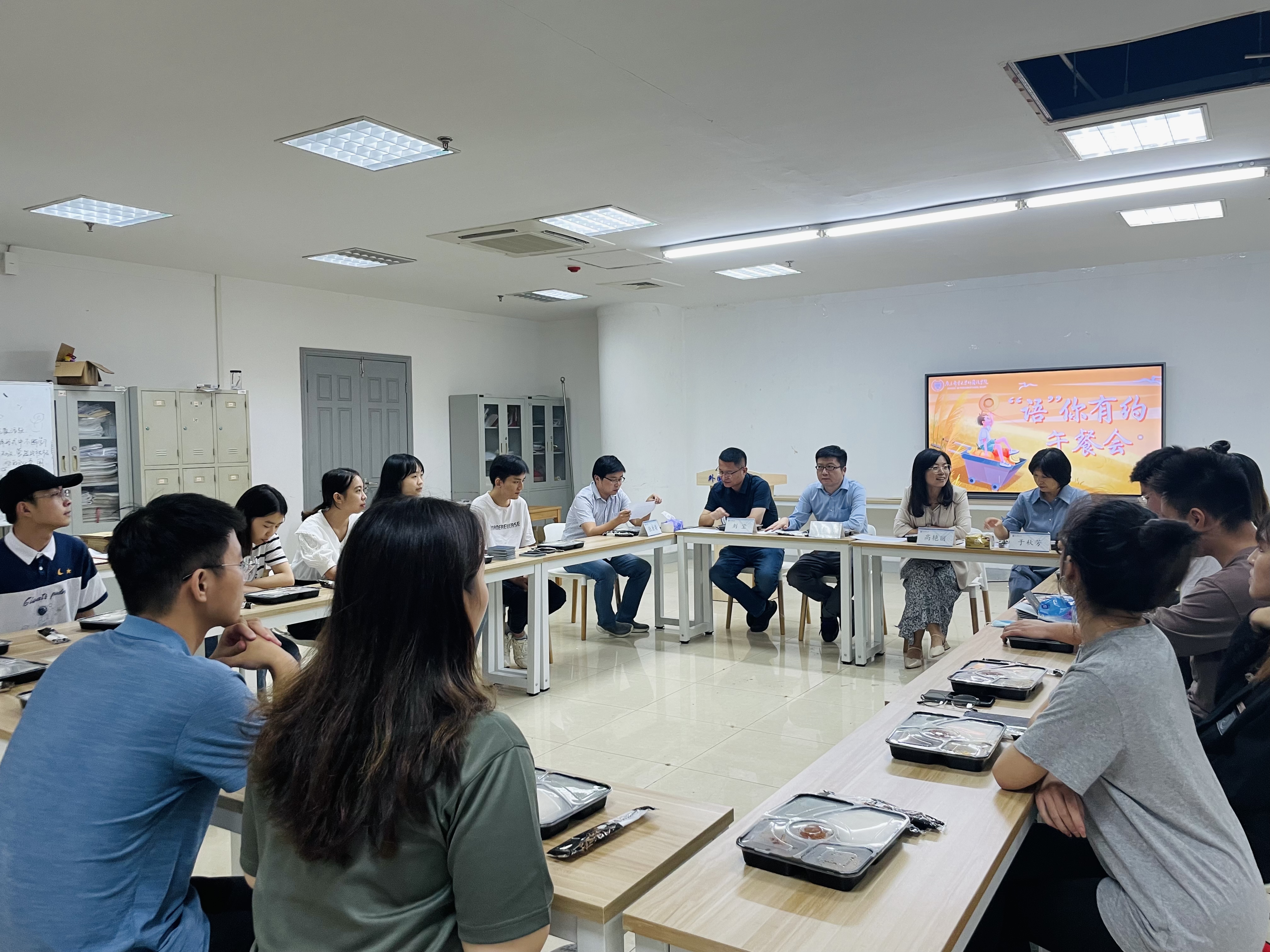 9月16日,新葡的京集团8814“语”你有约第一期午餐会在圆楼521举行。学院党委书记陈晓波,党委副书记、副院长高艳丽,副院长吴建、陈琳,翻译系主任刘宝、日语系主任于秋芳、办公室主任张唐梁及全体辅导员与2019级部分学生共进午餐,共话未来。