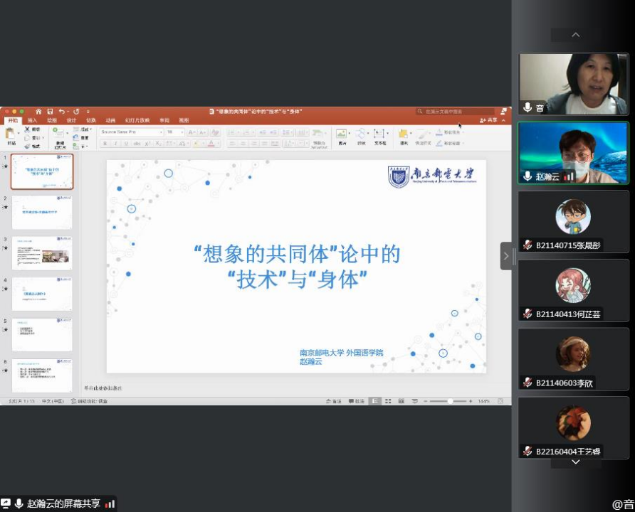 2022年11月10日,新葡的京集团8814“弘毅大讲堂——青年论坛”举行第九期研讨活动,日语系赵瀚云博士以“‘想象的共同体’论中的‘技术’与‘身体’”为题进行了线上讲座交流。各系部青年博士、教师代表、研究生及本科生一百余人参加活动。本期青年论坛由日语系主任于秋芳副教授主持。