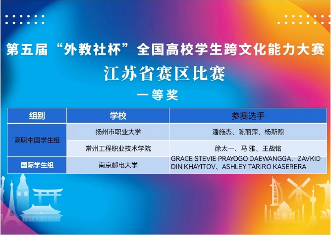 11月19日,第五届“外教社杯”全国高校学生跨文化能力大赛江苏省赛区比赛在南京举行。经过各校的层层选拔,来自省内近50所高校的53支参赛队伍参加了本次大赛。经过省内高校外国语言文学方面的专家学者严谨公正的评审,最终评出本科中国学生组、高职中国学生组和国际学生组一等奖、二等奖和三等奖各若干名。我校由三名留学生Grace Stevie Prayogo Daewangga (印度尼西亚籍), Zavkiddin Khayitov(乌兹别克斯坦籍)和Ashley Tariro Kaserera(津巴布韦籍)组成的参赛队伍(指导教师:王竞雄、刘涓涓、吴小海)获得江苏省赛区国际学生组一等奖,并将代表江苏省参加全国总决赛。这是继去年我校留学生以全省一等奖进入国赛并获得总决赛友谊之桥奖(一等奖)以来,国际学生团队再次晋级国赛。