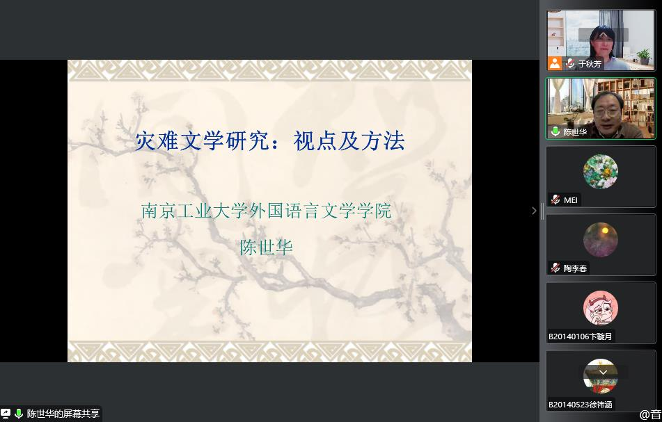 2022年12月8日,南京工业大学外国语言文学学院院长陈世华教授为新葡的京集团师生做了题为“灾难文学研究:视点及方法”的学术讲座,讲座由新葡的京集团日语系主任于秋芳老师主持,新葡的京集团8814本科生、研究生和部分教师共聚云端,聆听了本次讲座。