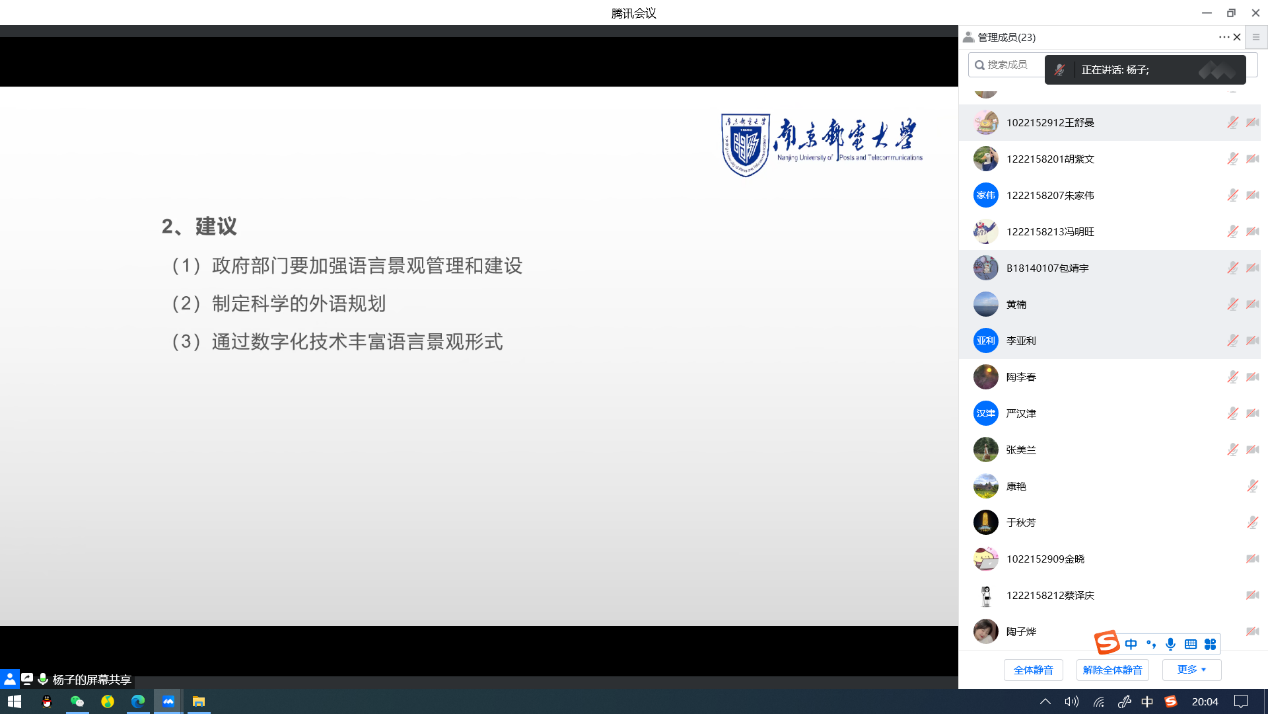 2022年12月7日,新葡的京集团8814“弘毅大讲堂——青年论坛”举行第十期研讨活动,翻译系杨子博士以“中国长三角地区中心城市语言景观调查研究——以南京市玄武区为例”为题进行了线上讲座交流。各系部青年博士、教师代表、研究生及本科生等参加活动。本期青年论坛由翻译系主任刘宝副教授主持。