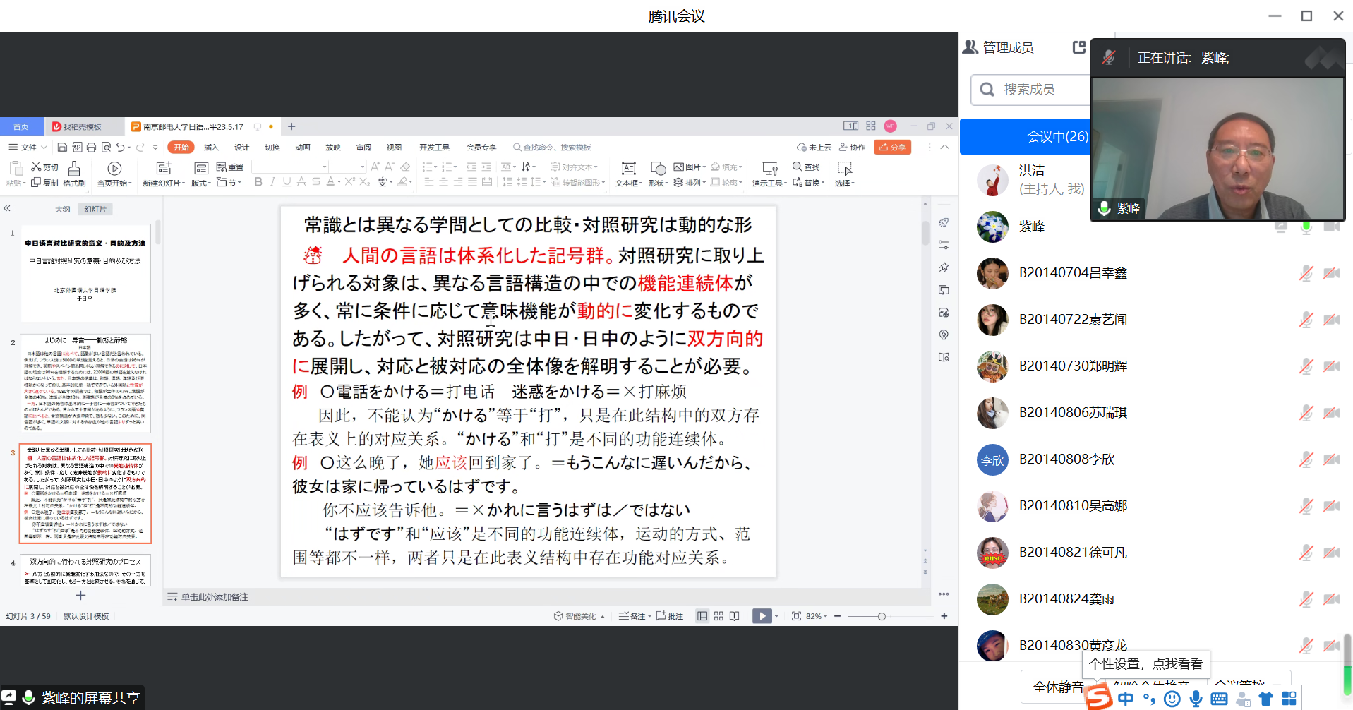 5月17日,北京外国语大学教授于日平为新葡的京集团师生做了题为《中日语言对比研究的意义、目的以及方法》的学术讲座。讲座以腾讯会议的形式举行,由新葡的京集团8814院长助理洪洁主持,新葡的京集团8814部分教师和学生参加了讲座。