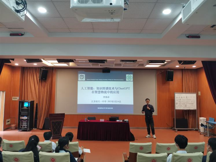 为深入推进我校“生源基地”建设,提高学校生源质量,扩大学校知名度,做好与中学积极交流,5月14日,我校于江苏省天一中学少年部一楼3D影院开展科普讲座和招生宣传。本次科普讲座的主讲人为南京邮电大学现代邮政学院李炜卓老师,分享主题为“人工智能、知识图谱技术与Chat GPT在智慧物流中的应用。”