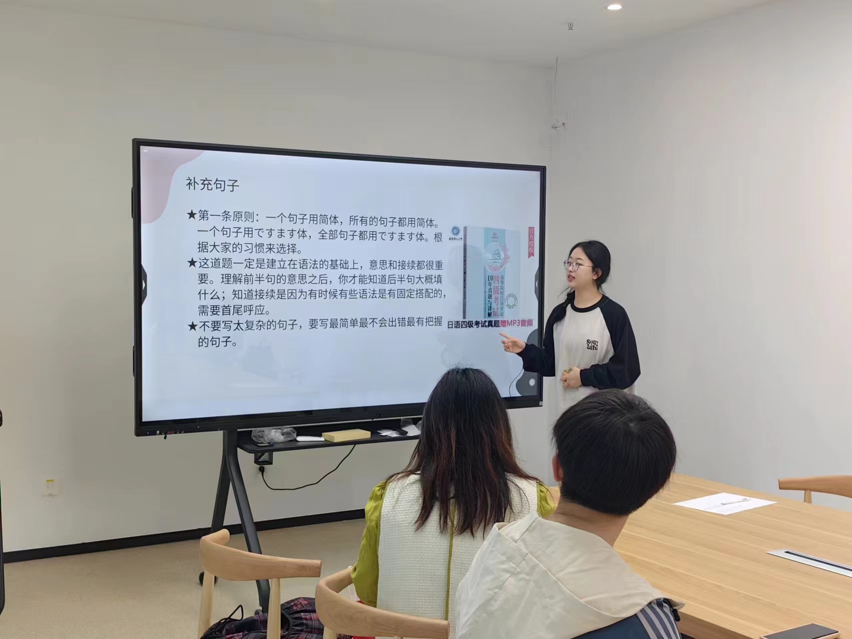 张靖扬同学英语专业四级优秀,擅长写作、阅读两个模块,他详细分享了自己备考时四个阶段的备考计划,以论文写作中不同单词的用法为例向同学们分享了自己在阅读学术期刊中学到的经验,也介绍了学术论文发表的心得体会。薛文瑄同学英语专业四级优秀,绩点和综合测评均为专业第一,她结合自身备考情况从听力、语法、阅读、写作四个方面分享了自己的学习方法,鼓励大家利用好习题及时巩固知识,并向同学们推荐了平时常用的学习公众号及软件。白一君同学日语专业四级优秀,擅长阅读模块,她分享了同一词汇的多种使用方法,强调多做练习的重要性,鼓励同学们多做精听练习以提高听力水平,认真阅读专业书籍以夯实专业基础。
