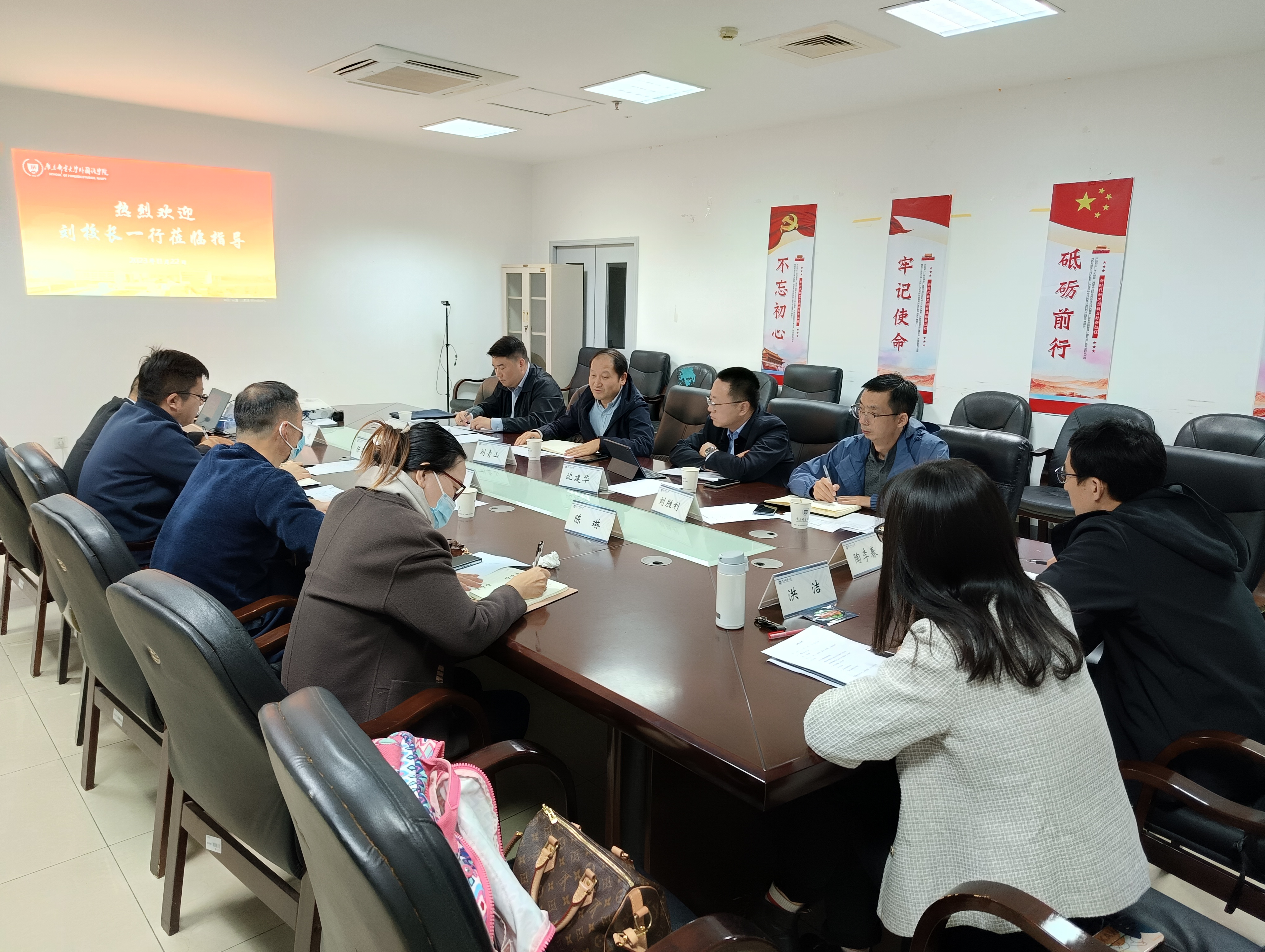 11月22日下午,校党委常委、副校长刘青山莅临外国语学院调研指导工作,教务处处长沈建华,副处长臧庆、刘胜利一同调研。全体院领导参加调研座谈,会议由院长袁周敏主持。