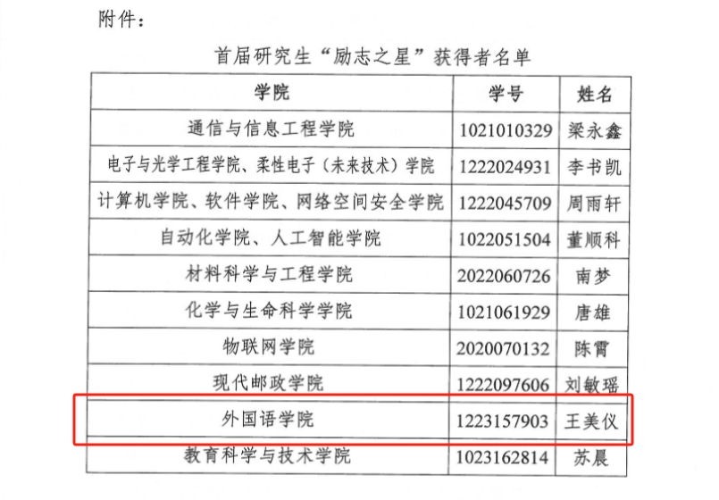 为深入学习贯彻习近平新时代中国特色社会主义思想和党的二十大精神,落实立德树人根本任务,我校党委研究生工作部组织开展首届研究生“励志之星”评选活动,新葡的京集团研究生王美仪同学获南京邮电大学2024年研究生“励志之星”荣誉。