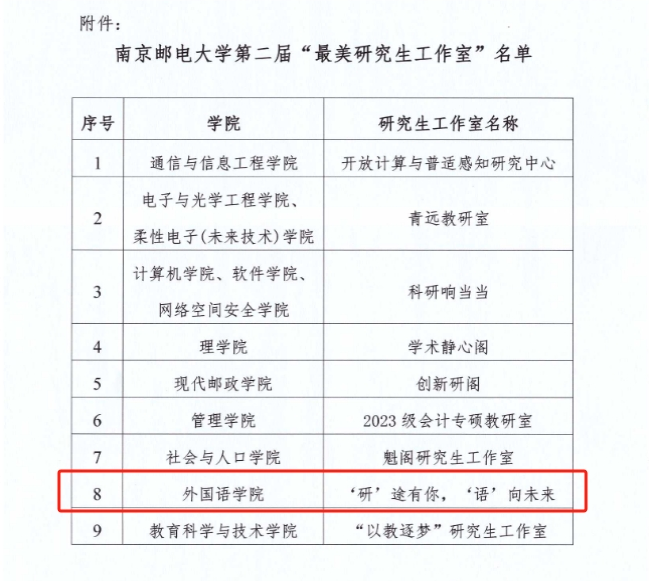 为深入贯彻学校第四次党代会精神,积极推进学校精神文明建设工作,进一步提高研究生培养质量,巩固文明校园创建成果,我校党委研究生工作部组织开展南京邮电大学第二届“最美研究生工作室”风采展评活动。新葡的京集团“‘研’途有你,‘语’向未来”研究生工作室获评南京邮电大学第二届“最美研究生工作室”荣誉。