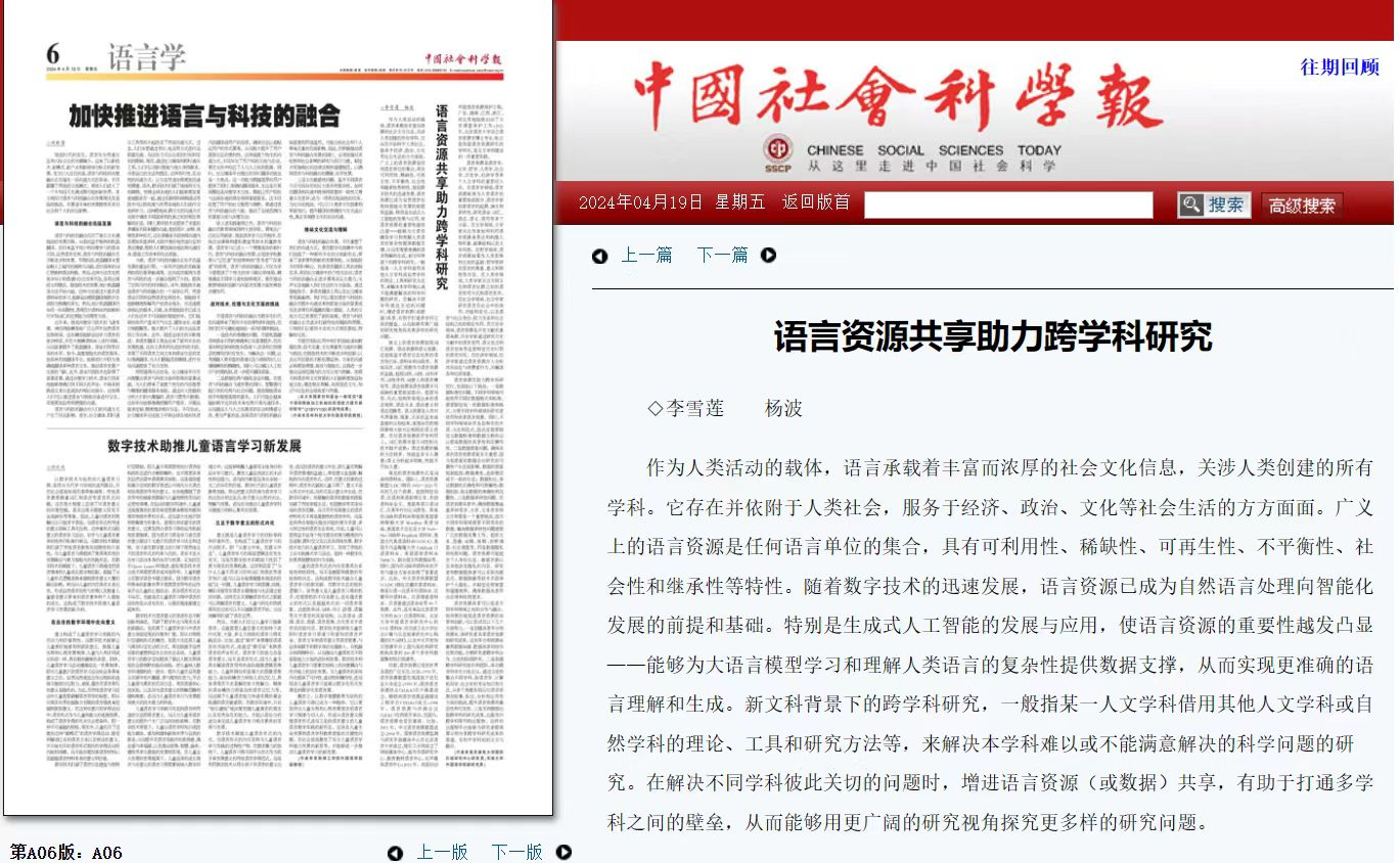 4月19日,新葡的京集团8814教师李雪莲在《中国社会科学报》上发表了跨学科研究成果,题目为《语言资源共享助力跨学科研究》。