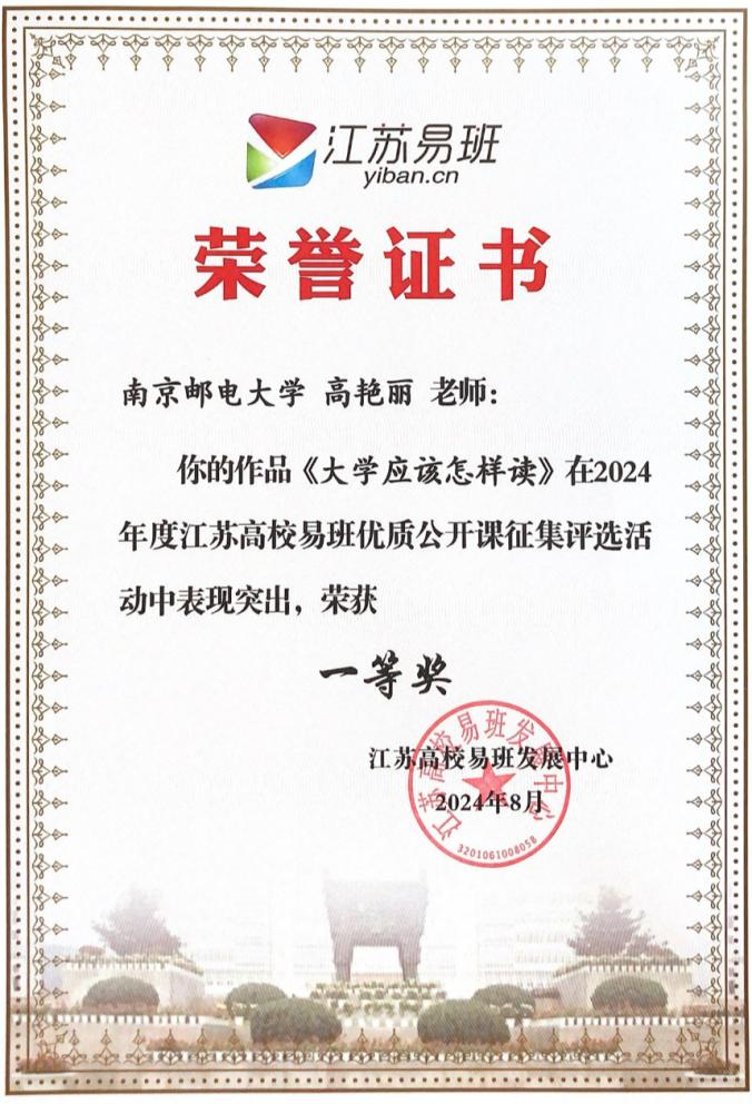 按照《关于组织开展2024年度江苏高校易班优质公开课征集评选活动的通知》(苏易班(2024)3号)要求,近日,江苏高校易班发展中心组织了2024年度江苏高校易班优质公开课评审工作,新葡的京集团高艳丽老师主讲的微课《大学应该怎样读》荣获一等奖。