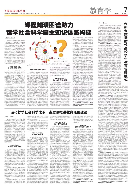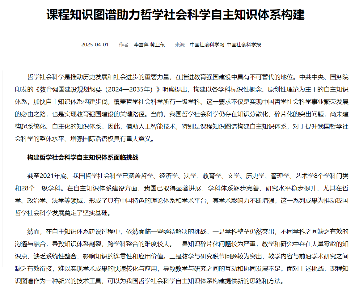 文章指出,哲学社会科学在推动历史进程和社会发展中发挥着不可替代的作用,是实现教育强国建设的重要支撑。面对当前我国哲学社会科学知识体系存在的知识分散化、碎片化等问题,文章提出以人工智能为支撑,通过构建课程知识图谱助力自主知识体系建设的新路径。文章从学科体系、教学体系、教材体系和学术体系四个层面,系统阐述了课程知识图谱在整合知识资源、优化教学设计、支撑教材编写、促进教学与科研融合等方面的关键作用,提出通过结构化知识的组织方式,推动中国特色哲学社会科学体系的系统化建构和国际影响力提升。
