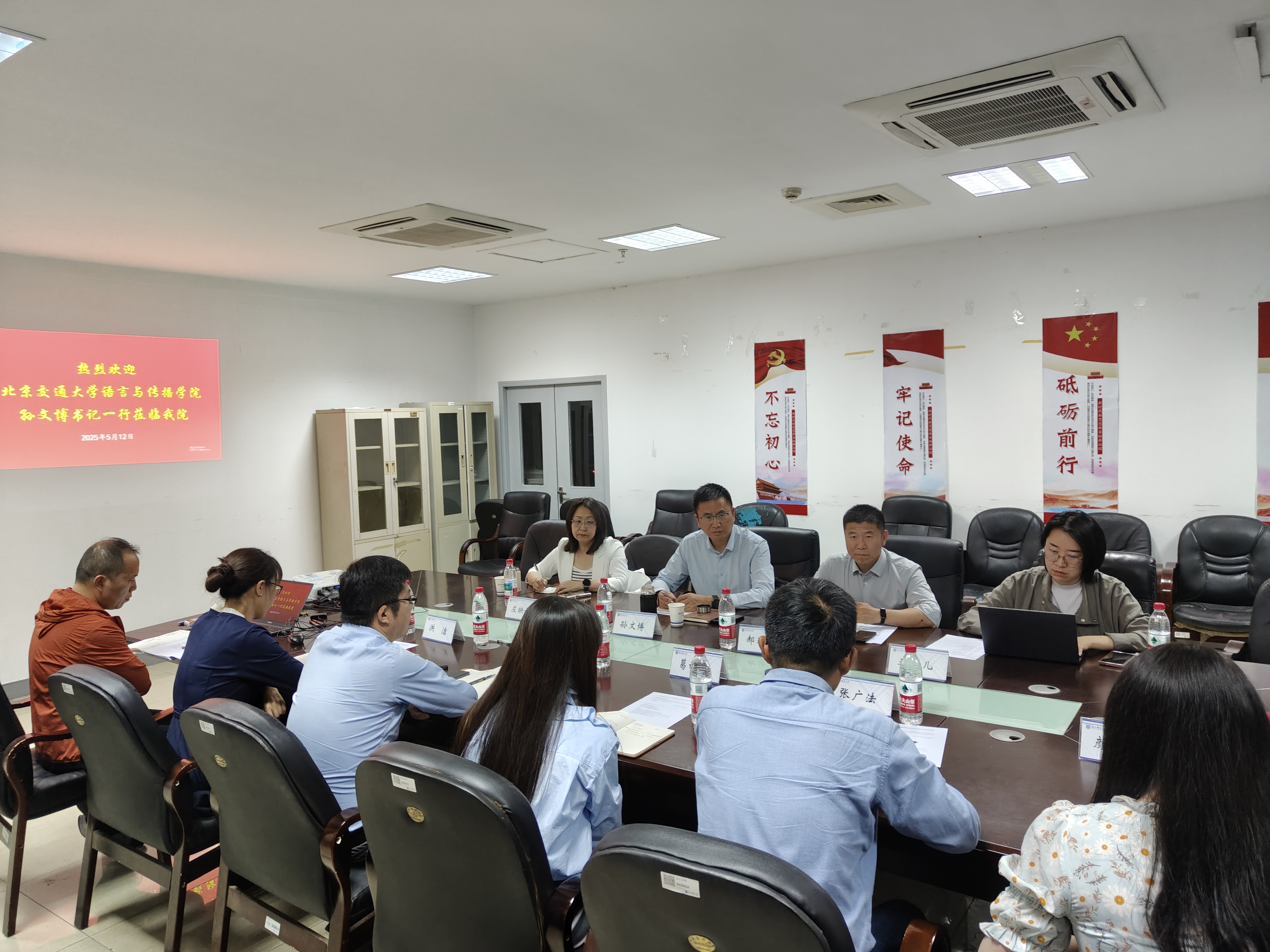 5月12日下午,北京交通大学语言与传播学院来新葡的京集团调研交流。北京交通大学语言与传播学院党委书记孙文博、副院长郝运慧、公共英语部副主任左映娟、欧亚语系副主任李蓓儿,新葡的京集团8814党委书记陈晓波、副院长葛谢飞、副院长洪洁以及相关系部主任参加调研交流会,会议由陈晓波书记主持。