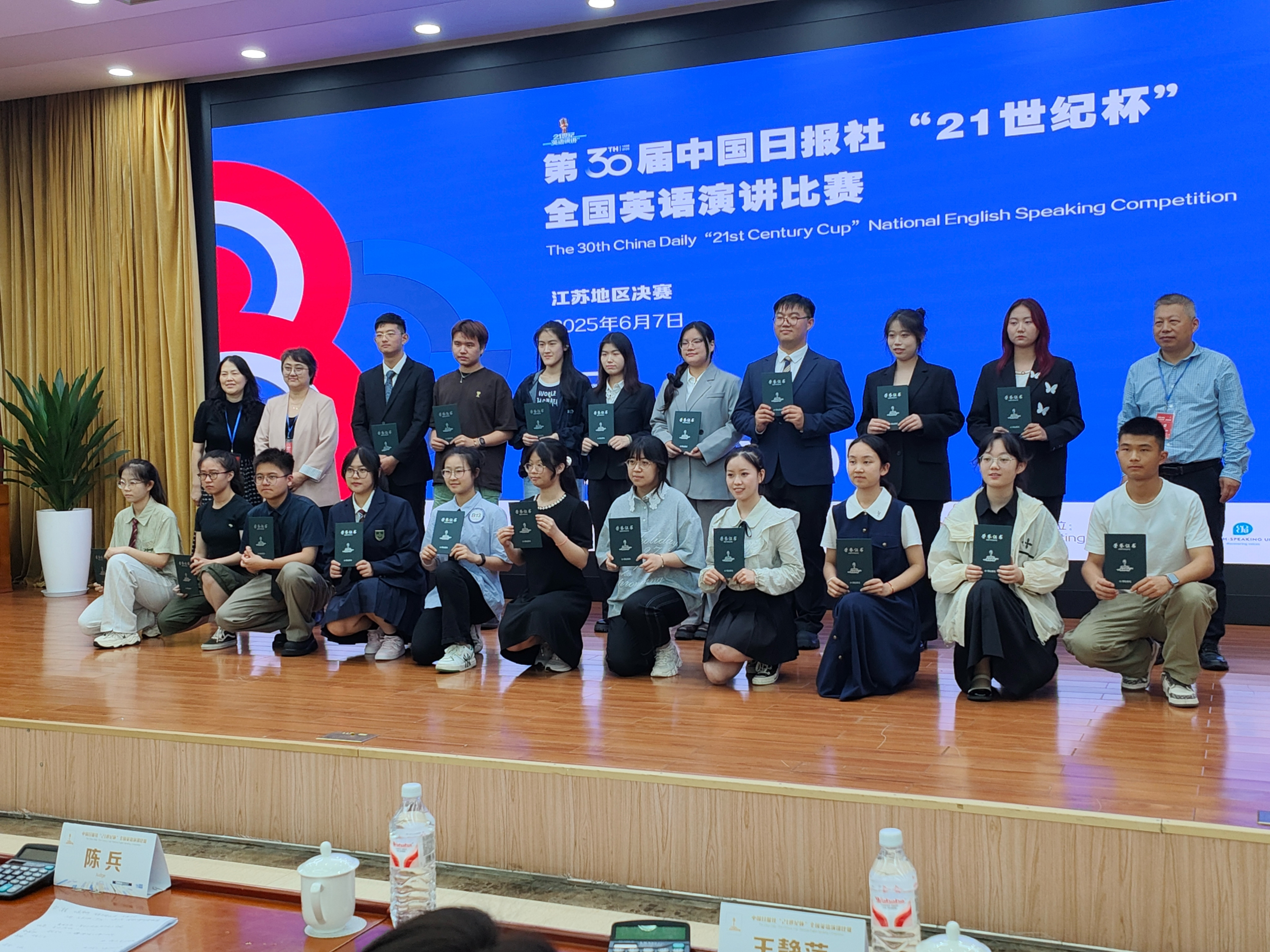 在2025年6月7日落幕的第30届中国日报社“21世纪杯”全国英语演讲比赛江苏地区决赛中,我校三名参赛选手张一凡、戴若虚、陈一凡脱颖而出,分别荣获二等奖1项、三等奖2项。