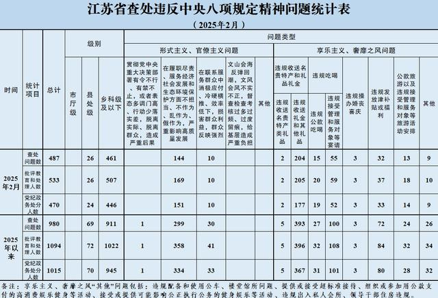 2025年2月,全省共查处违反中央八项规定精神问题487起,批评教育和处理533人、其中给予党纪政务处分470人。从问题类型看,查处形式主义、官僚主义问题154起、批评教育和处理179人,查处享乐主义、奢靡之风问题333起、批评教育和处理354人。从人员级别看,批评教育和处理县处级干部26人、乡科级及以下人员507人。