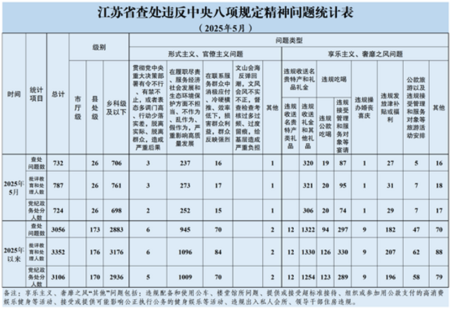 2025年5月,全省共查处违反中央八项规定精神问题732起,批评教育和处理787人、其中给予党纪政务处分724人。从问题类型看,查处形式主义、官僚主义问题257起、批评教育和处理294人,查处享乐主义、奢靡之风问题475起、批评教育和处理493人。从人员级别看,批评教育和处理县处级干部26人、乡科级及以下人员761人。