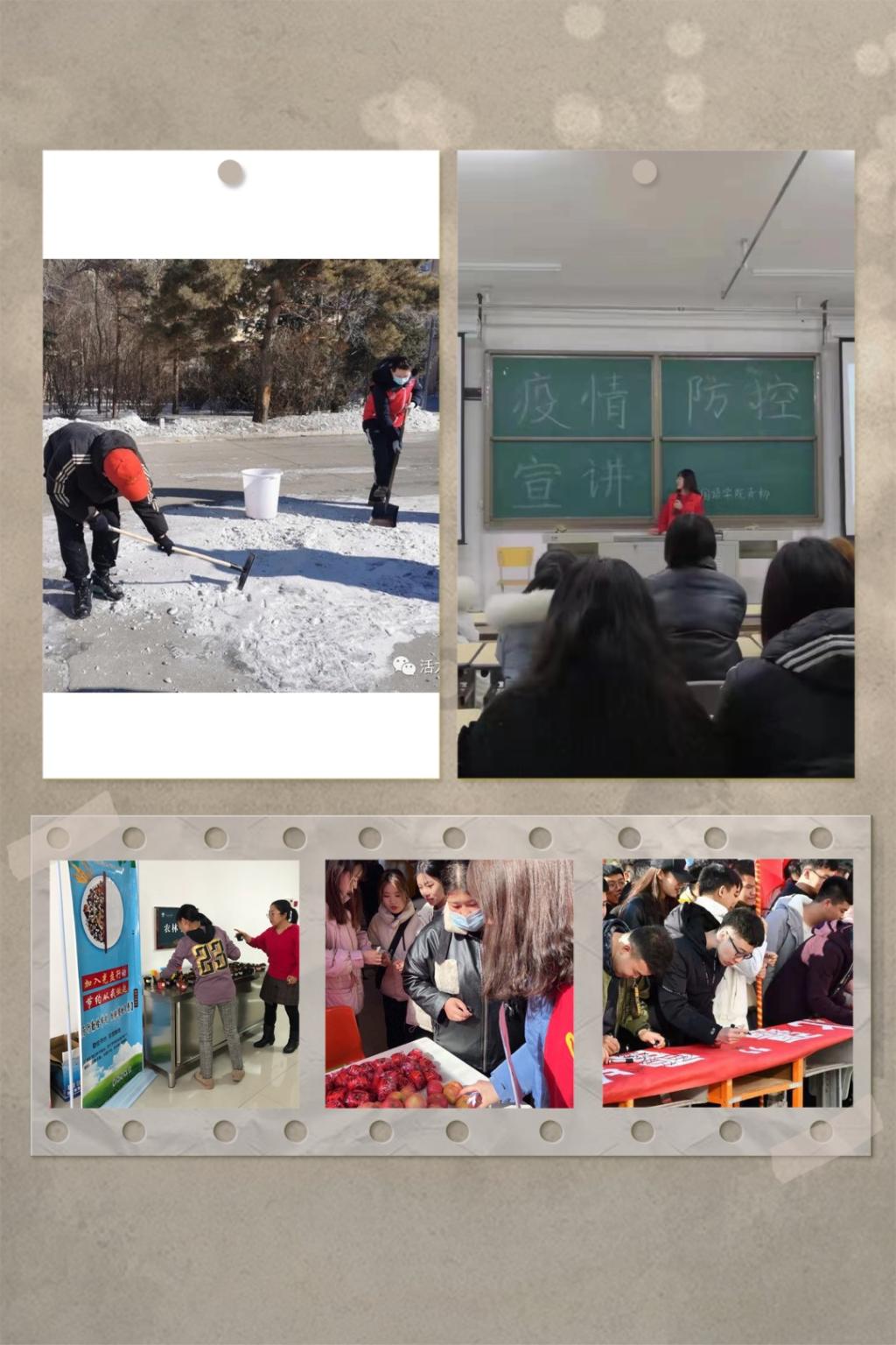 传媒学院、教育学院、音乐与舞蹈学院、数学与统计学院、文学院、美术学院、旅游与地理学院、体育学院青年志愿者开展了清理校园卫生死角活动;美术学院、生命科学学院志愿者开展了破冰除雪行动。活动中,志愿者们不怕脏不怕累,通过自己的劳动创造了干净舒适的校园环境。