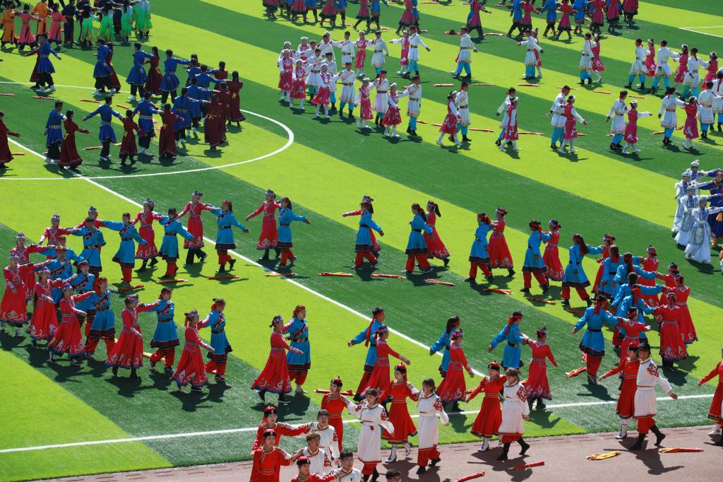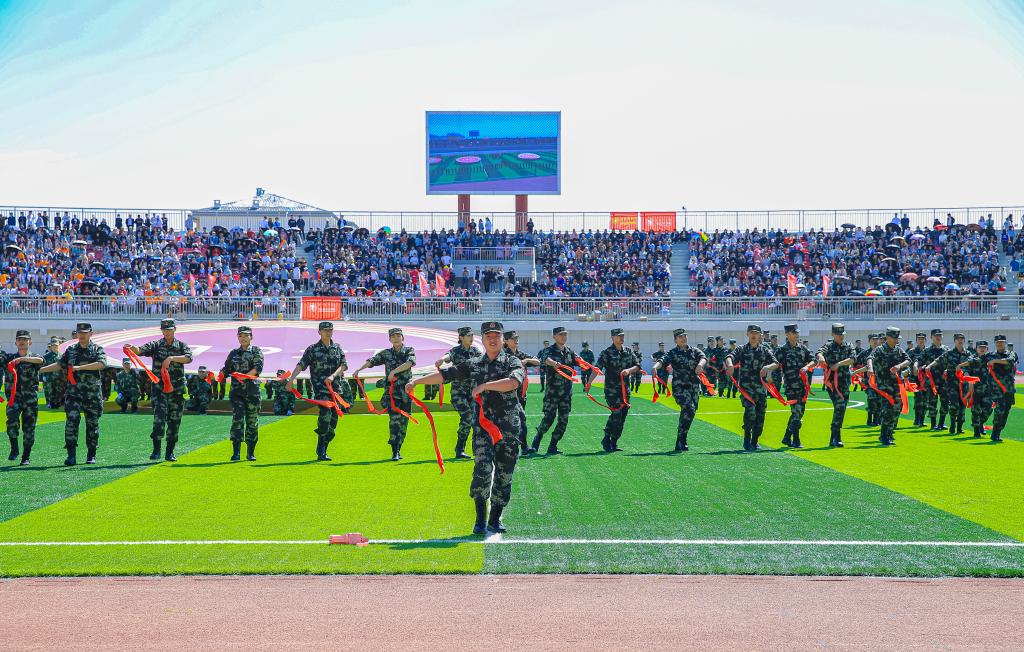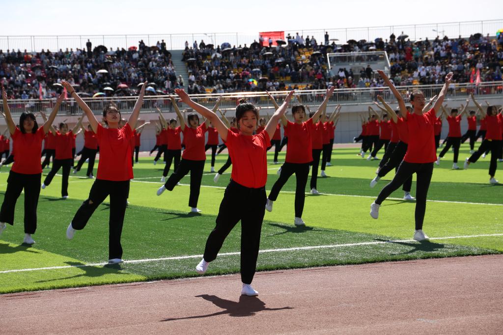 随后,在悠扬的旋律中,身着各民族艳丽服装的一千余名学子跳起了民族民间舞,用优美的舞姿阐释美好年华,并摆出党旗形状,用激扬的青春献礼建党百年。在第九套广播体操熟悉的节奏中,300名同学广播体操表演让人眼前一亮,笔直的队列,整齐的动作,摆出“中国”“爱心”造型彰显了呼院学子蓬勃的朝气,献礼建党百年华诞。民兵应急营的擒拿格斗组合拳表演整齐划一,为现场师生带来的表演“舞武”相映跳起快乐的舞蹈,精彩的表演博得一阵阵掌声瞬间点燃整个体育场;摆出“100”造型,歌颂幸福生活歌颂伟大的中国共产党。在全体师生的热烈欢呼声中,开幕式落下帷幕,运动会比赛正式开始!