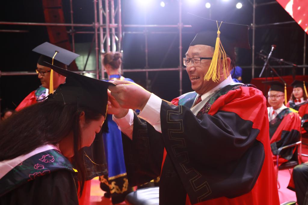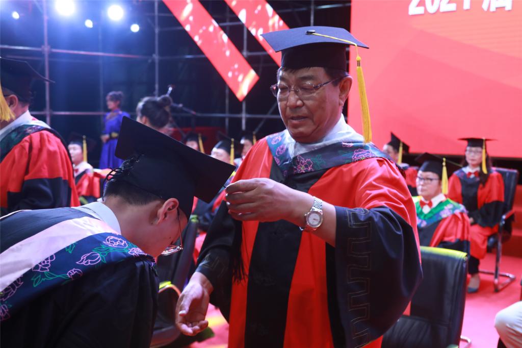 典礼在庄严的国歌声中拉开帷幕。敖特根副校长宣读了2021届本、专科毕业生名单、授予学士学位人员名单和双学士学位人员名单。学校领导为获得毕业证的本专科毕业生代表颁发毕业证书。学校领导和学士学位委员会委员为获得学士学位的毕业生代表拨穗正冠、授予学位。