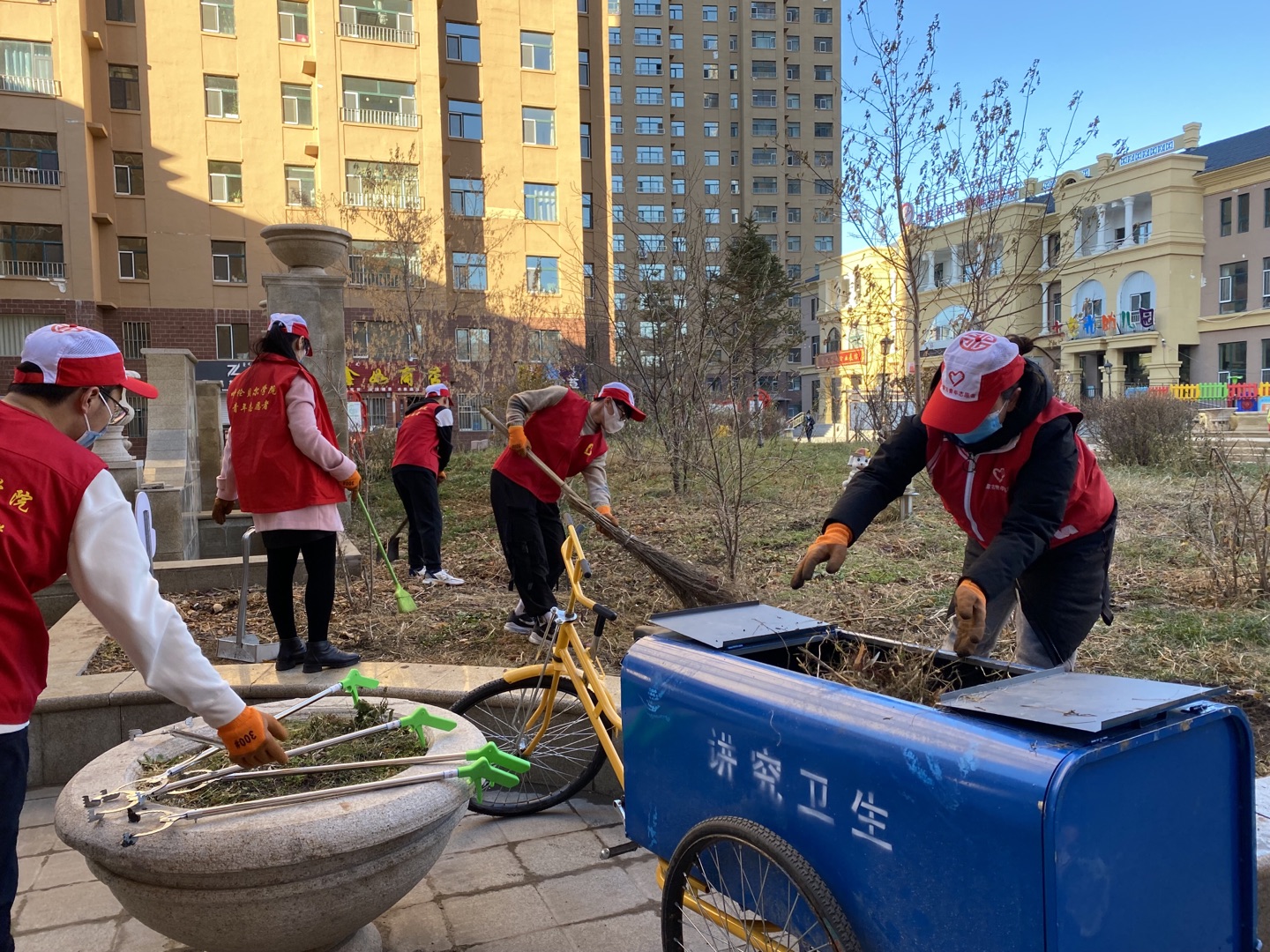 在社区工作人员的安排下,老师和志愿者们开始清理小区的绿化带。随着秋季的来临以及海拉尔的天气影响,垃圾被吹落在小区各角落,枯枝败叶散落在绿化带里。在有序的分工后,各位教师党员积极发挥模范带头作用,带领同学们一同收拾垃圾杂草。