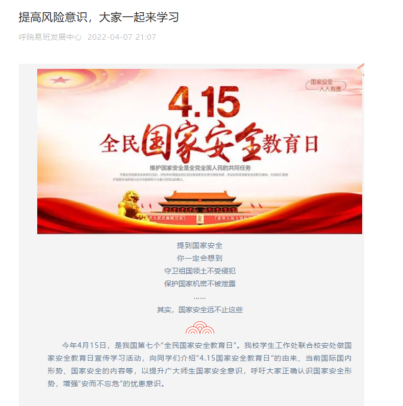 为提升Beat365师生国家安全意识,4月1日——15日,学校以“为树牢总体国家安全观,感悟新时代国家安全成就,为迎接党的二十大胜利召开营造良好氛围”为主题开展国家安全教育日系列活动,内容包括国家安全教育展板巡展、发放国家安全教育学习资料、学校官微、易班推文、国家安全知识竞赛、生物安全知识竞赛、国家安全教育线上宣讲、教职工大学习等活动。全校约6000余名师生参加了线上线下组织的各项活动,取得了良好的教育效果。