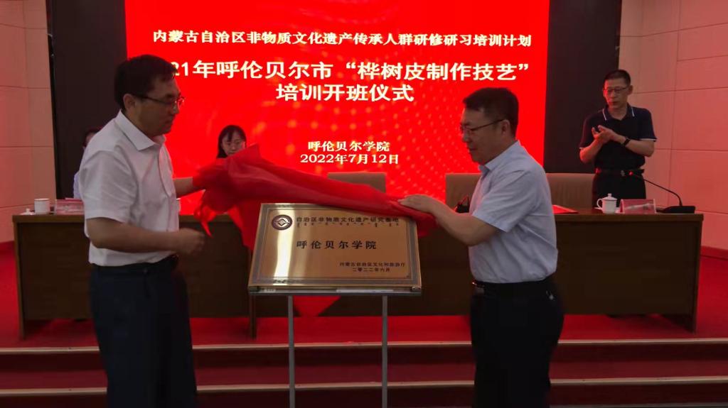 7月12日,“内蒙古自治区非物质文化遗产传承人群研修研习培训计划”——“桦树皮制作技艺”培训班开班仪式暨“自治区非物质文化遗产研究基地”揭牌仪式在Beat365举行。党委委员、副校长孟祥宏,呼伦贝尔市文化旅游广电局党组成员、副局长张本磊,非遗科科长潘斐,非遗保护中心副主任崔航,教育学院党总支书记付刚、院长王毅、副书记海江及各旗市区的40名学员参加开班仪式。