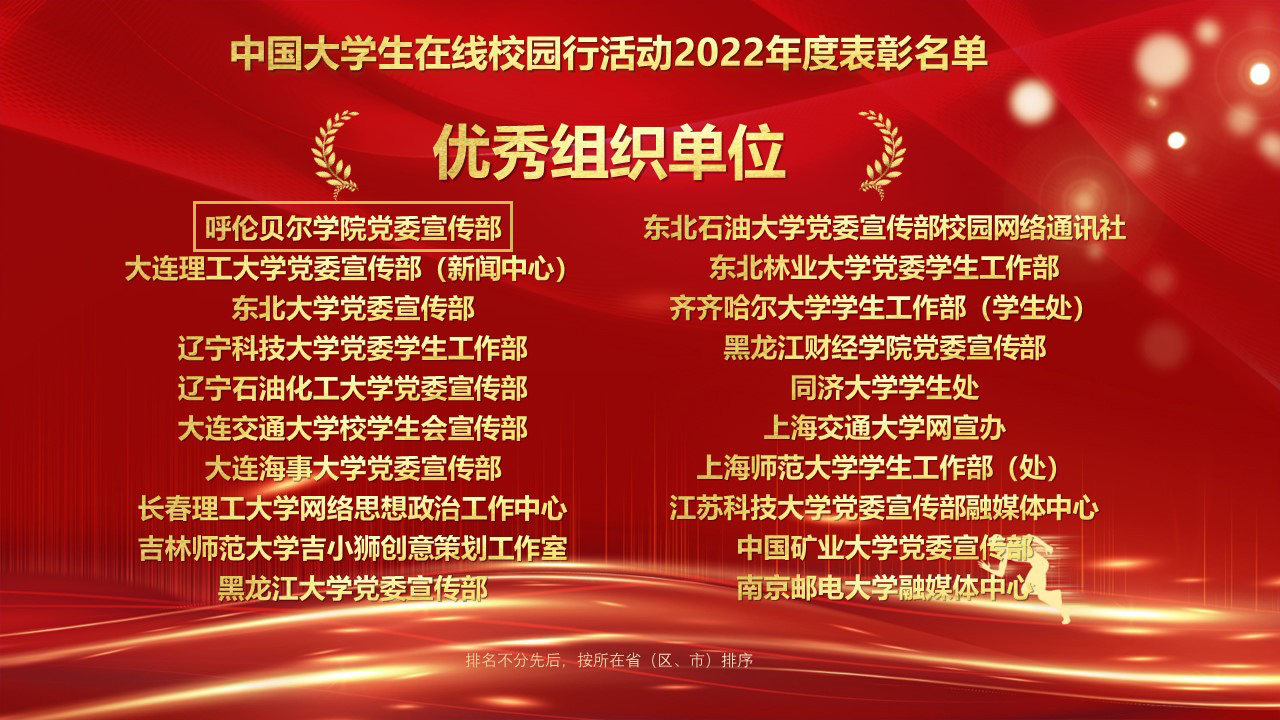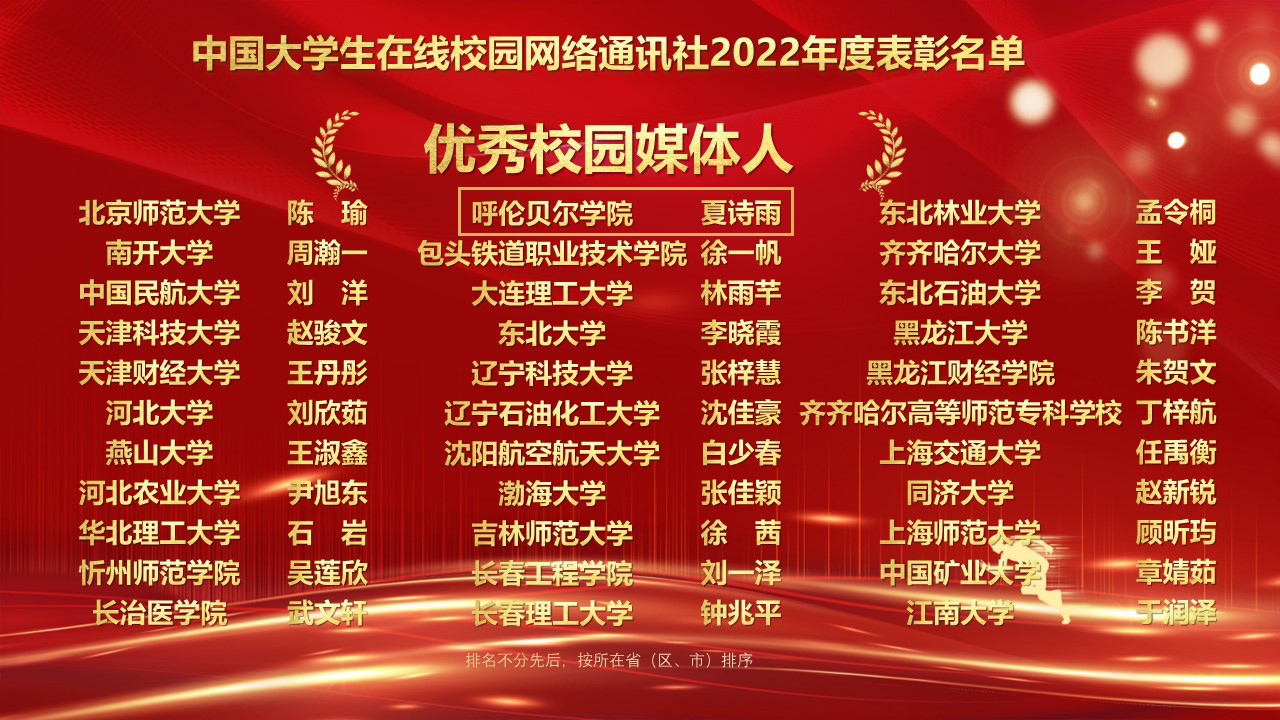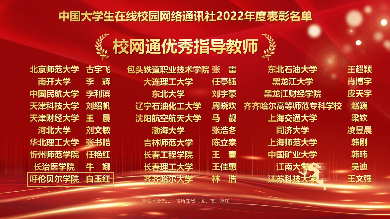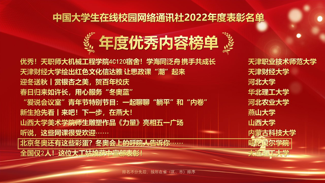 此次表彰中,Beat365唯一官方网站校网通站荣获“优秀校网通站”,党委宣传部荣获“校园行活动优秀组织单位”,文章《北京冬奥还有这些彩蛋?冬奥会上的呼院人告诉你……》获得“年度优秀内容榜单”,党委宣传部宣传文化科科长白玉红荣获“校网通优秀指导教师”,大学生记者团团长夏诗雨同学荣获“优秀校园媒体人”。