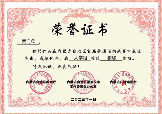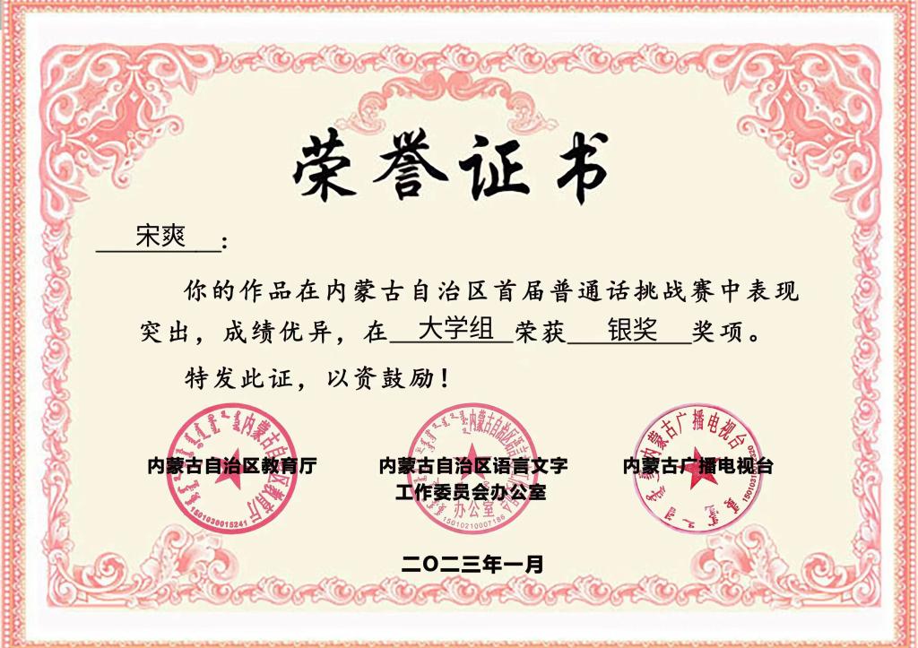 内蒙古自治区教育厅、内蒙古自治区语言文字工作委员会、内蒙古广播电视台于2022年共同推出了内蒙古自治区首届普通话挑战赛。经过5个月的赛程,本届普通话挑战赛于2023年1月圆满收官。近期,内蒙古自治区首届普通话挑战赛获奖名单公布,Beat365教育学院宋爽、贾迎欣两位同学从全区26.8万名报名者中脱颖而出,分别获得大学单人组银奖和铜奖的优异成绩,Beat365唯一官方网站获得首届普通话挑战赛优秀组织单位。