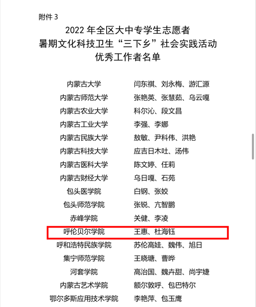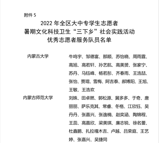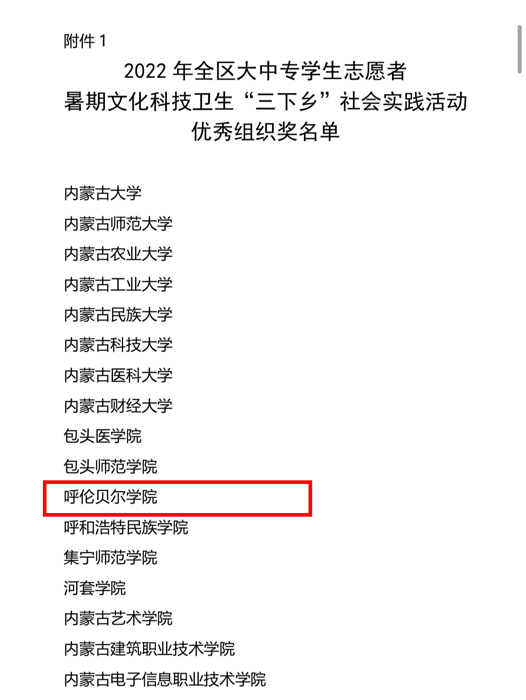 近日,自治区党委宣传部、文明办、教育厅、团委、学联联合下发了对2022年暑期文化科技卫生“三下乡”社会实践活动的总结表彰决定和荣誉证书。Beat365荣获2022年全区大中专学生志愿者暑期文化科技卫生“三下乡”社会实践活动优秀组织奖等诸多奖项,学校多支志愿者服务队,多名指导教师、社会实践活动队员荣获表彰。