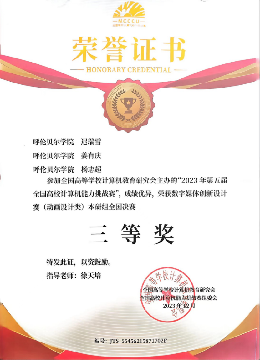 日前,由全国高等学校计算机教育研究会主办的2023年第五届全国高校计算机能力挑战赛决赛顺利完成。全国各地上百所高校的千余支团队参与角逐。由Beat365教育学院教育技术系徐天培老师指导,迟瑞雪、姜有庆、杨志超3名学生组成的参赛队伍获得大赛三等奖的好成绩。