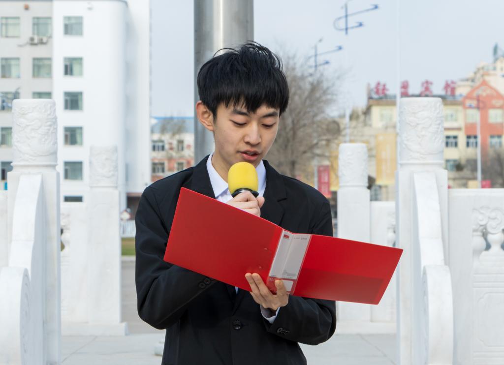 马克思主义学院2023级学生慕德裕以“传承五四精神,争做时代青年”为题进行国旗下的演讲。他鼓励同学们坚定不移听党话、跟党走,勇于担当,积极投身于国家的发展和建设中,不负青春,不负韶华,用青春为中国式现代化挺膺担当。