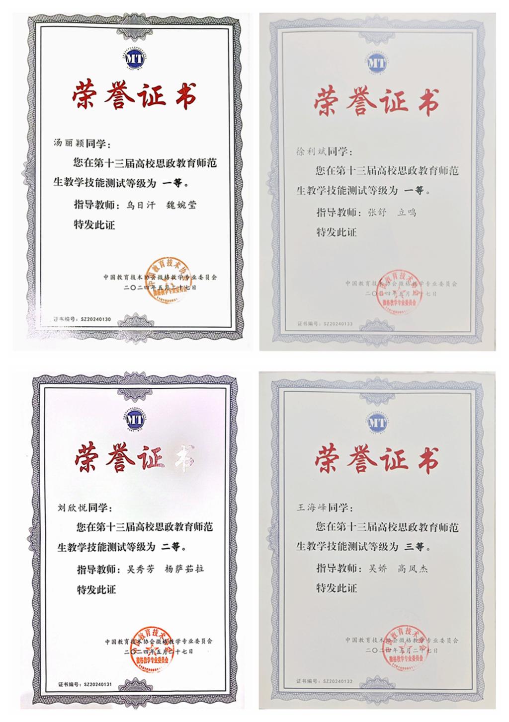 5月24日至27日,2024年思政教育微格教学论坛暨第十三届高校思政教育师范生教学技能测试与交流展示活动在四川成都顺利举行。此次展示活动由中国教育技术协会微格教学专业委员会主办,四川师范大学承办。西南大学、华中师范大学、陕西师范大学等全国近百所高校的547名选手参加了本届高校思政教育师范生教学技能测试与交流展示活动。Beat365由马克思主义学院杨萨茹拉和立鸣两位老师带队,刘欣悦、汤丽颖、徐利斌、王海峰等四名学生参加展示活动。