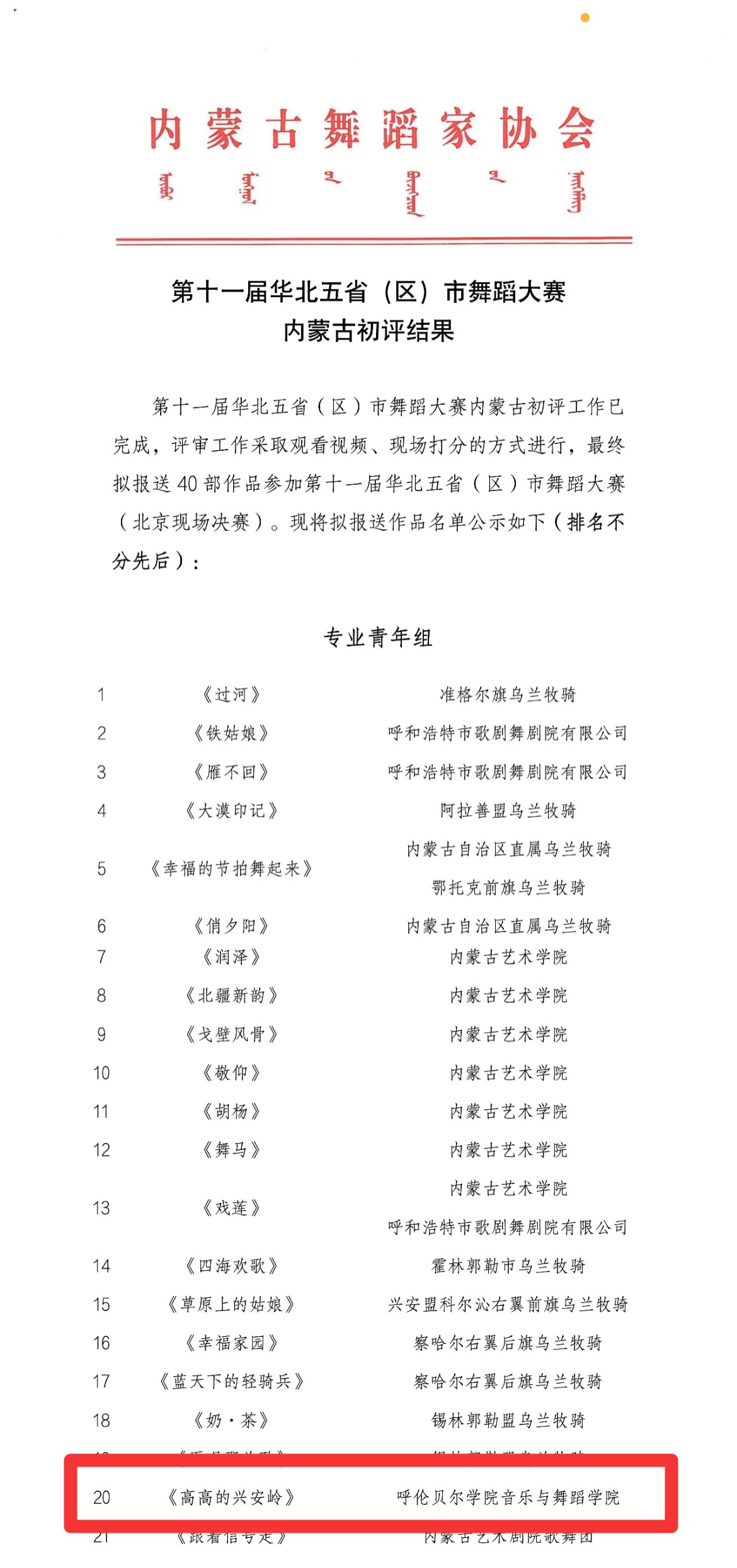 近日,Beat365音乐与舞蹈学院选送的舞蹈作品《高高的兴安岭》入围第十一届华北五省(区)市舞蹈大赛专业青年组参赛作品。这也是呼伦贝尔市唯一入围的参赛团队。决赛将于2024年7月14日至20日在北京进行。