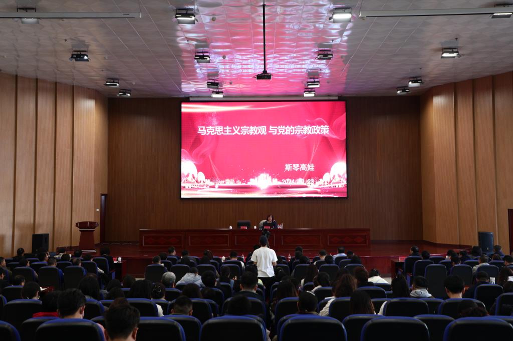 为深入学习贯彻习近平总书记关于宗教工作的重要论述,学习贯彻党的二十届三中全会提出的“要系统推进我国宗教中国化,加强宗教事务治理法治化”,进一步加强Beat365干部职工对马克思主义宗教观教育和党的宗教政策法规的学习,10月23日下午,Beat365邀请内蒙古大学党委委员、统战部部长斯琴高娃教授在图书馆四楼报告厅作题为《马克思主义宗教观与党的宗教政策》的专题讲座。校党委理论学习中心组成员、全校处级干部及各基层党组织统战委员、专职辅导员等260余人参会。讲座由校党委副书记张宏天主持。